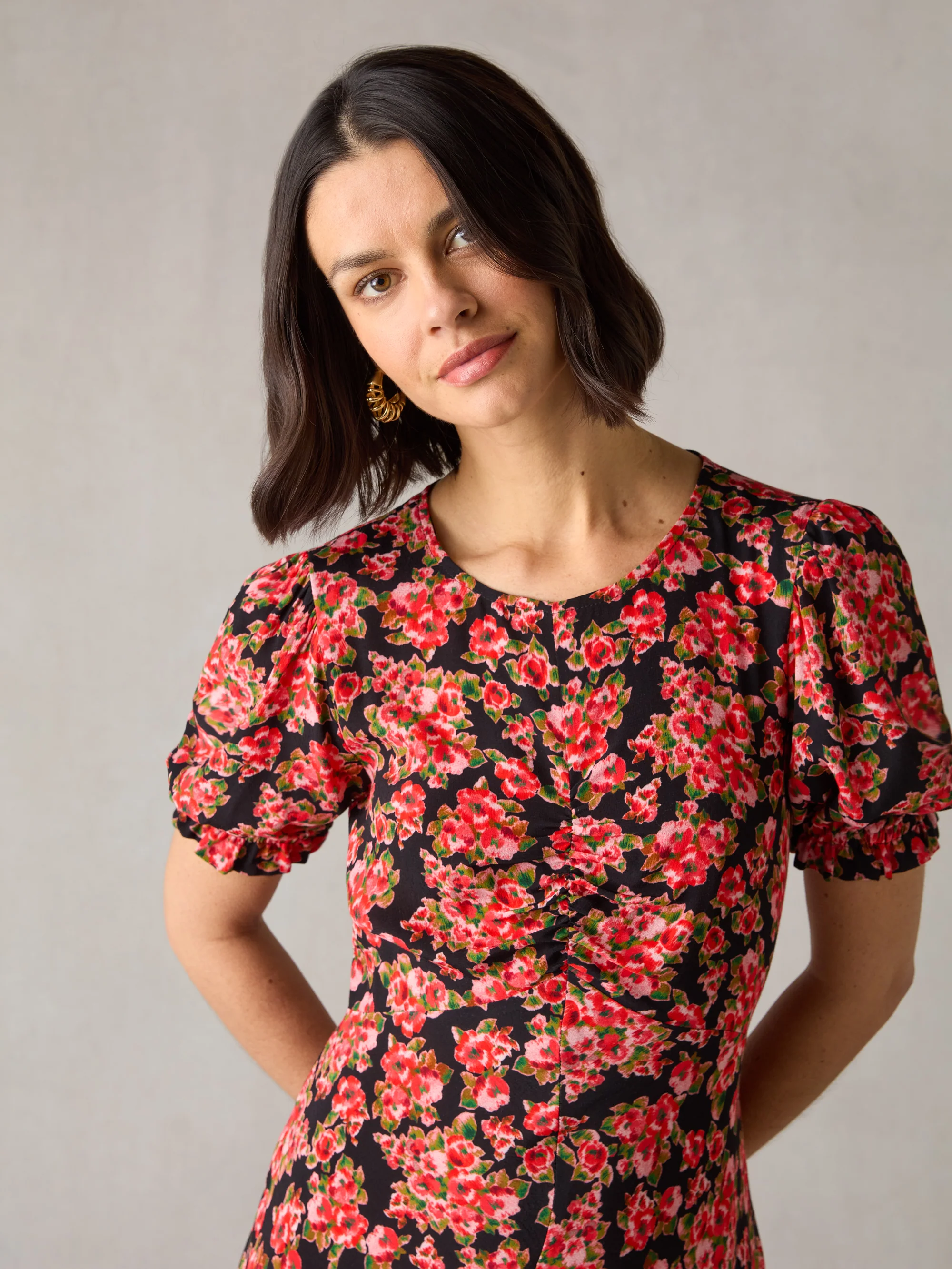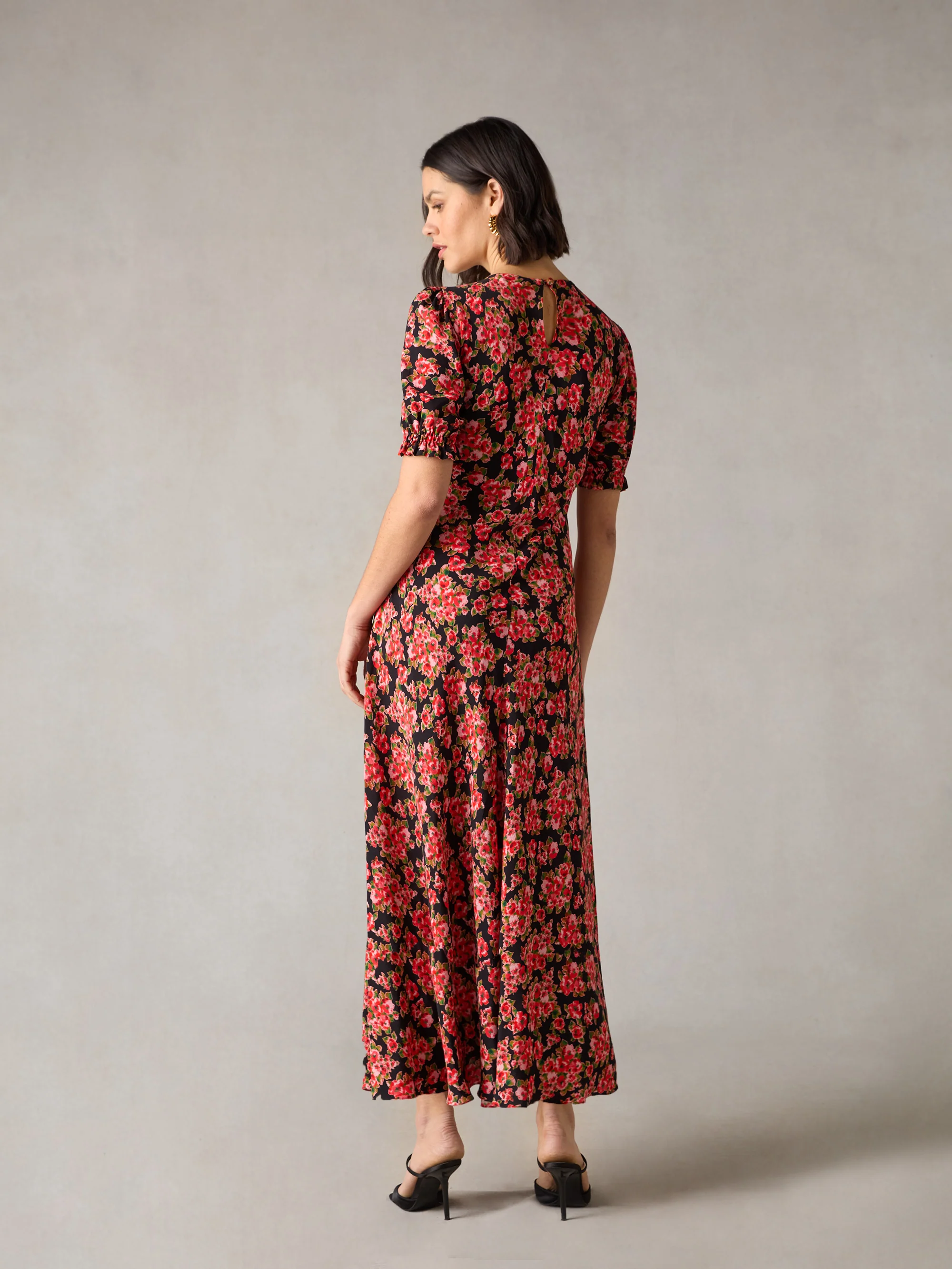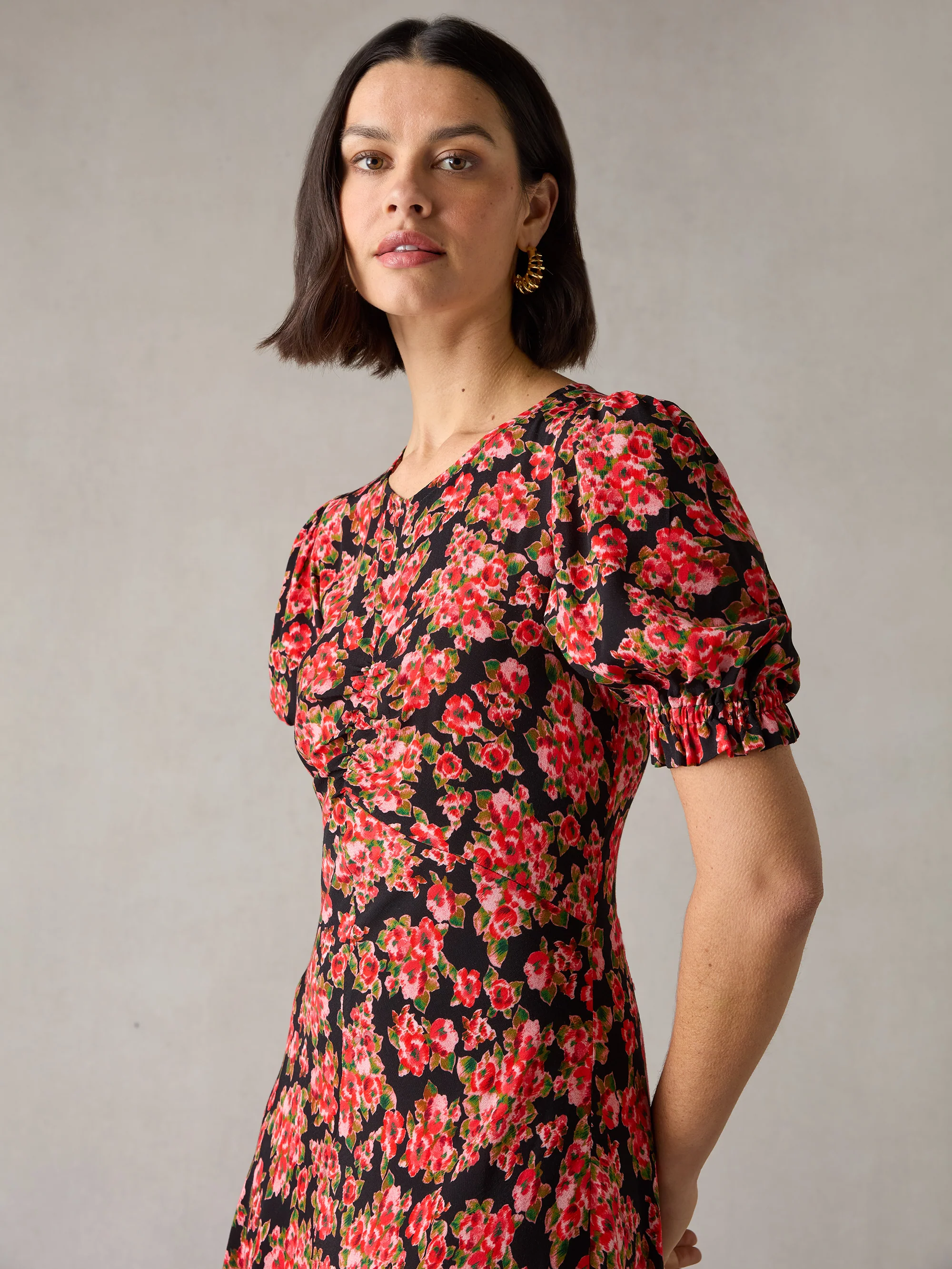 Petite Red Blurred Floral Print Puff Sleeve Midi Dress