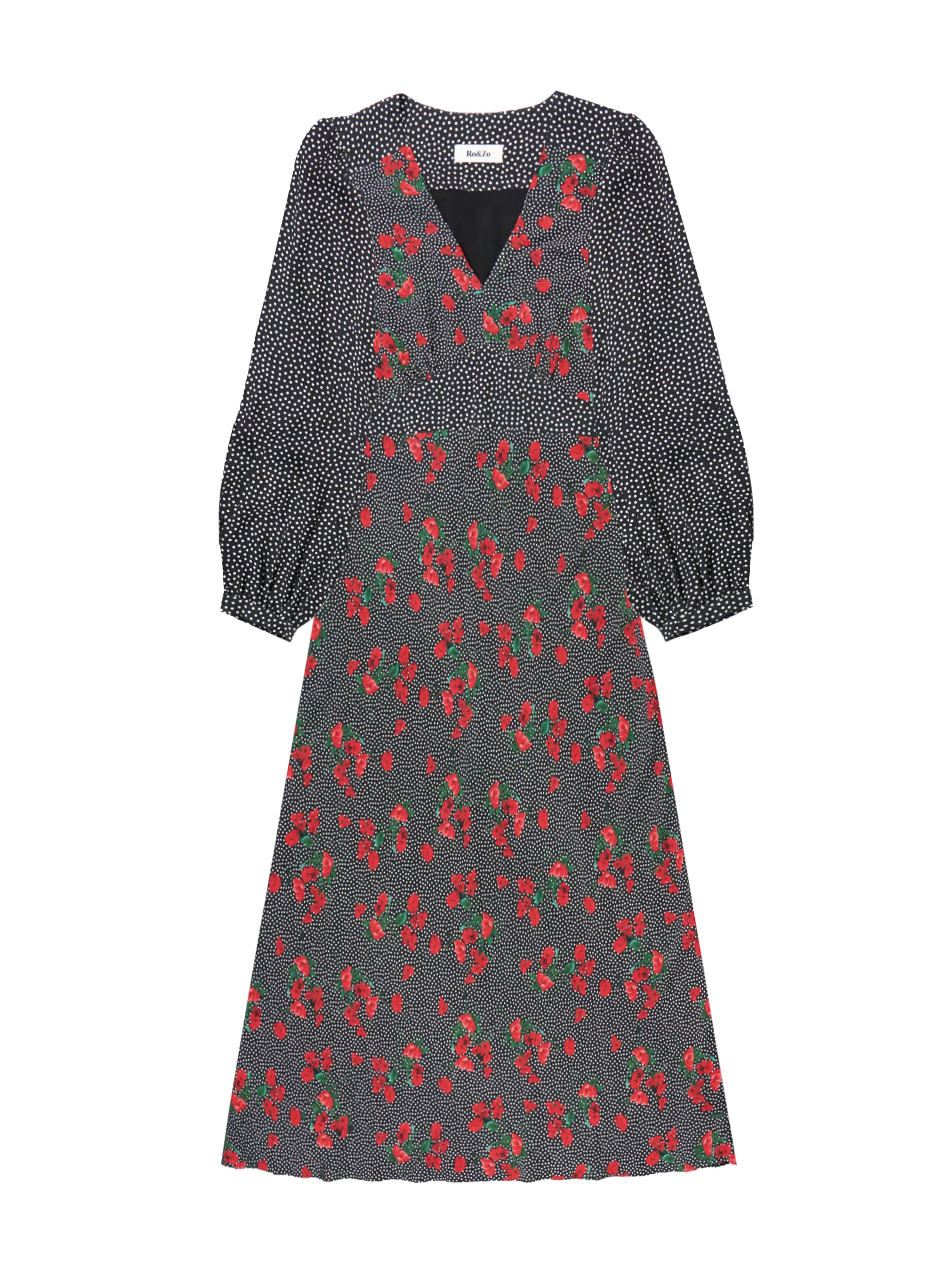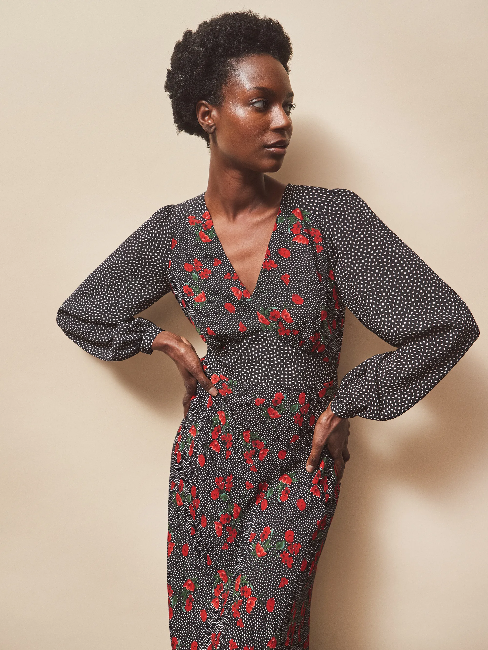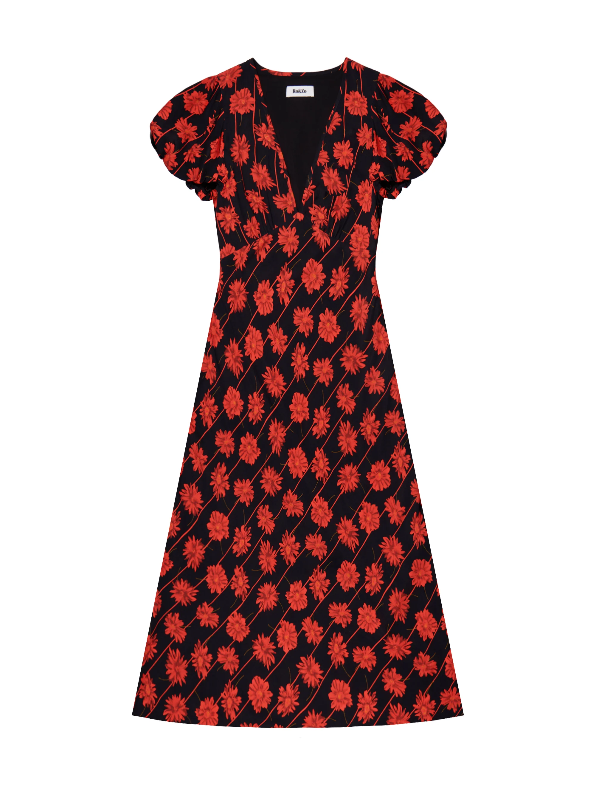 Petite Red Blurred Floral Print Puff Sleeve Midi Dress