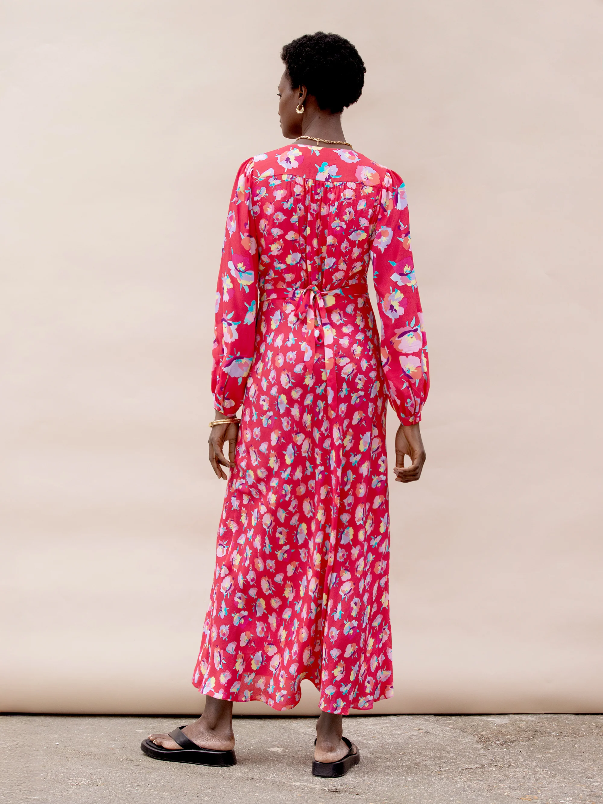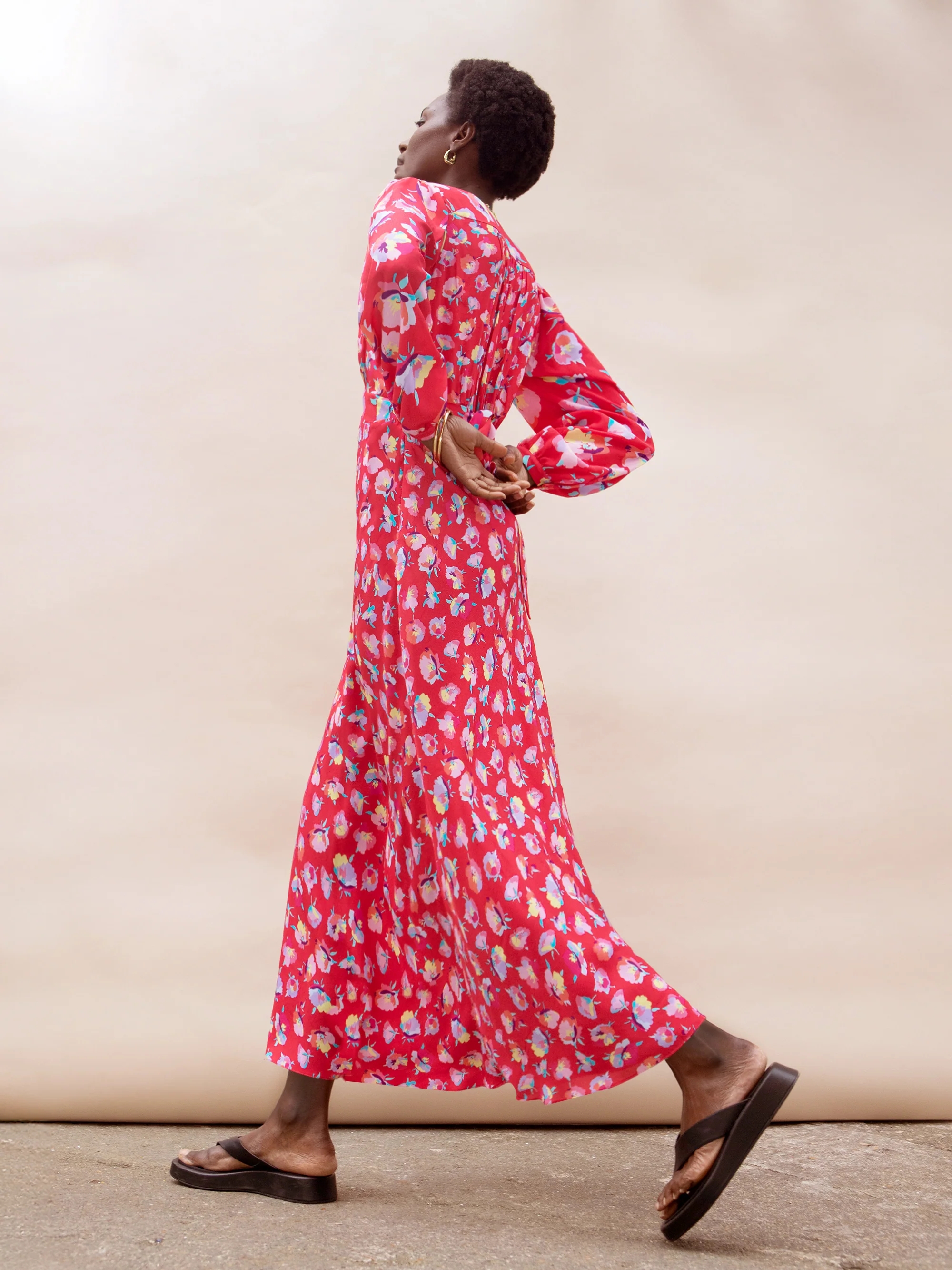 Multi Pansy Print Shirred Cuff Midi Dress