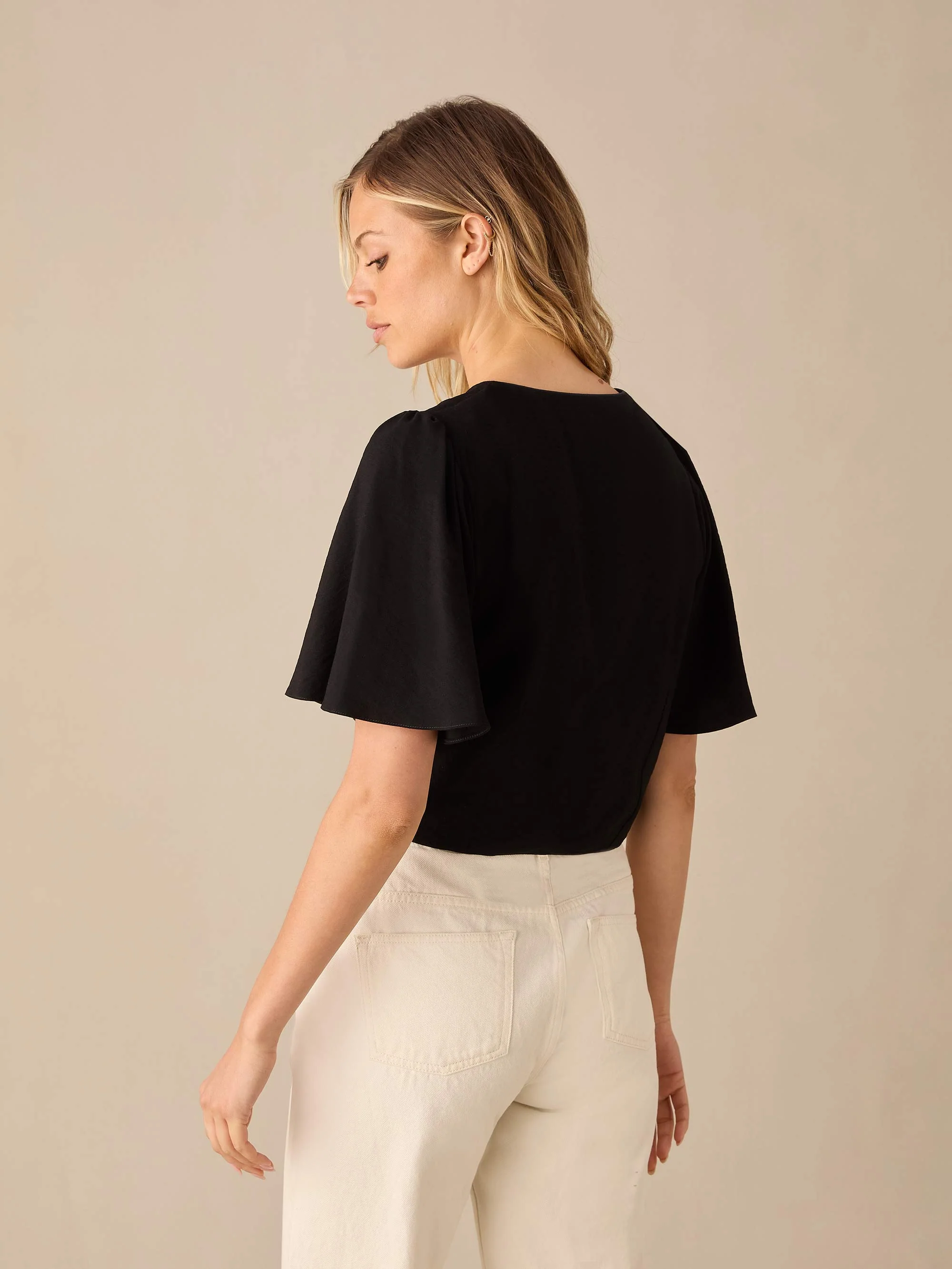 Black Flutter Sleeve Tie Front Top