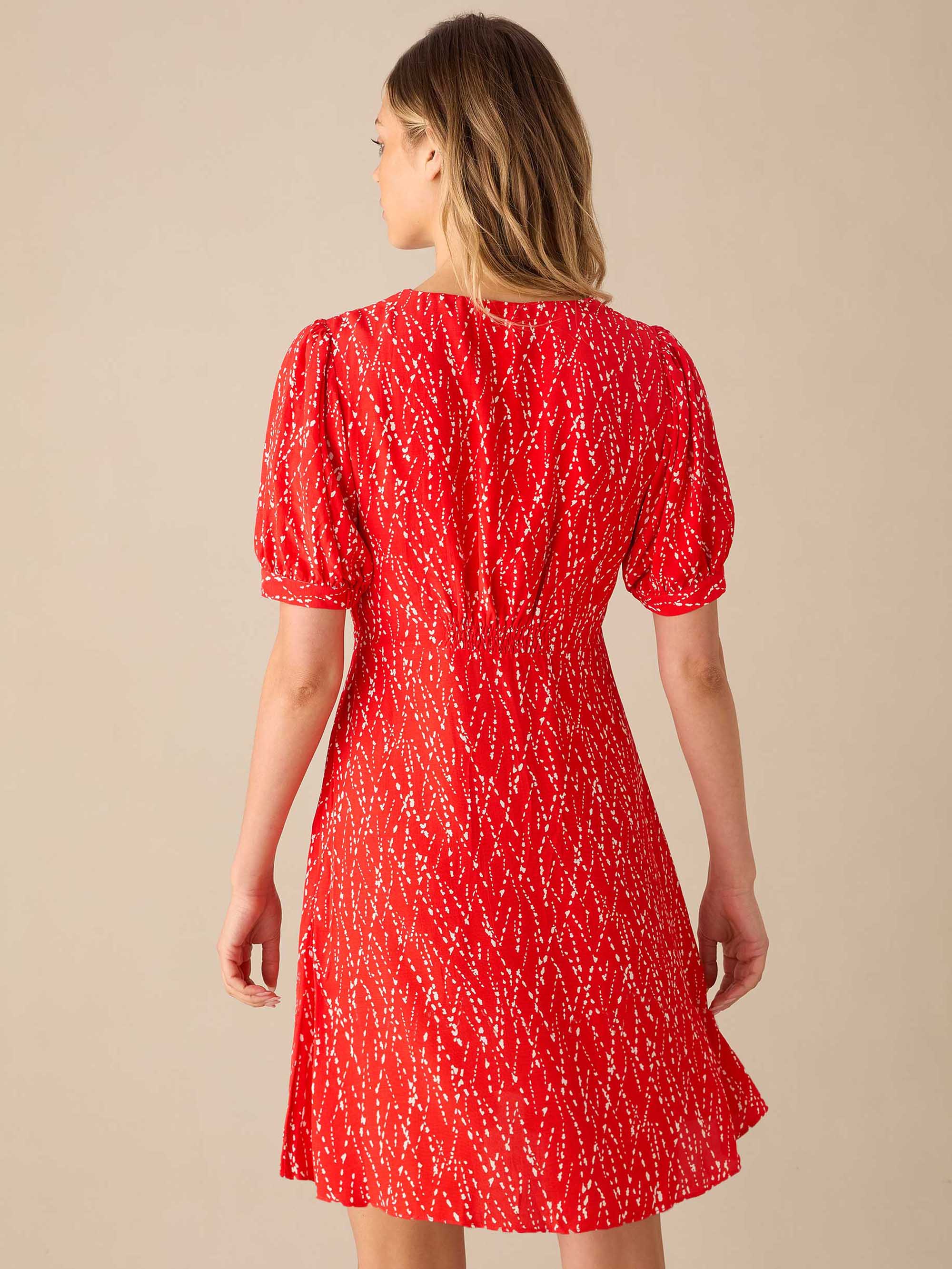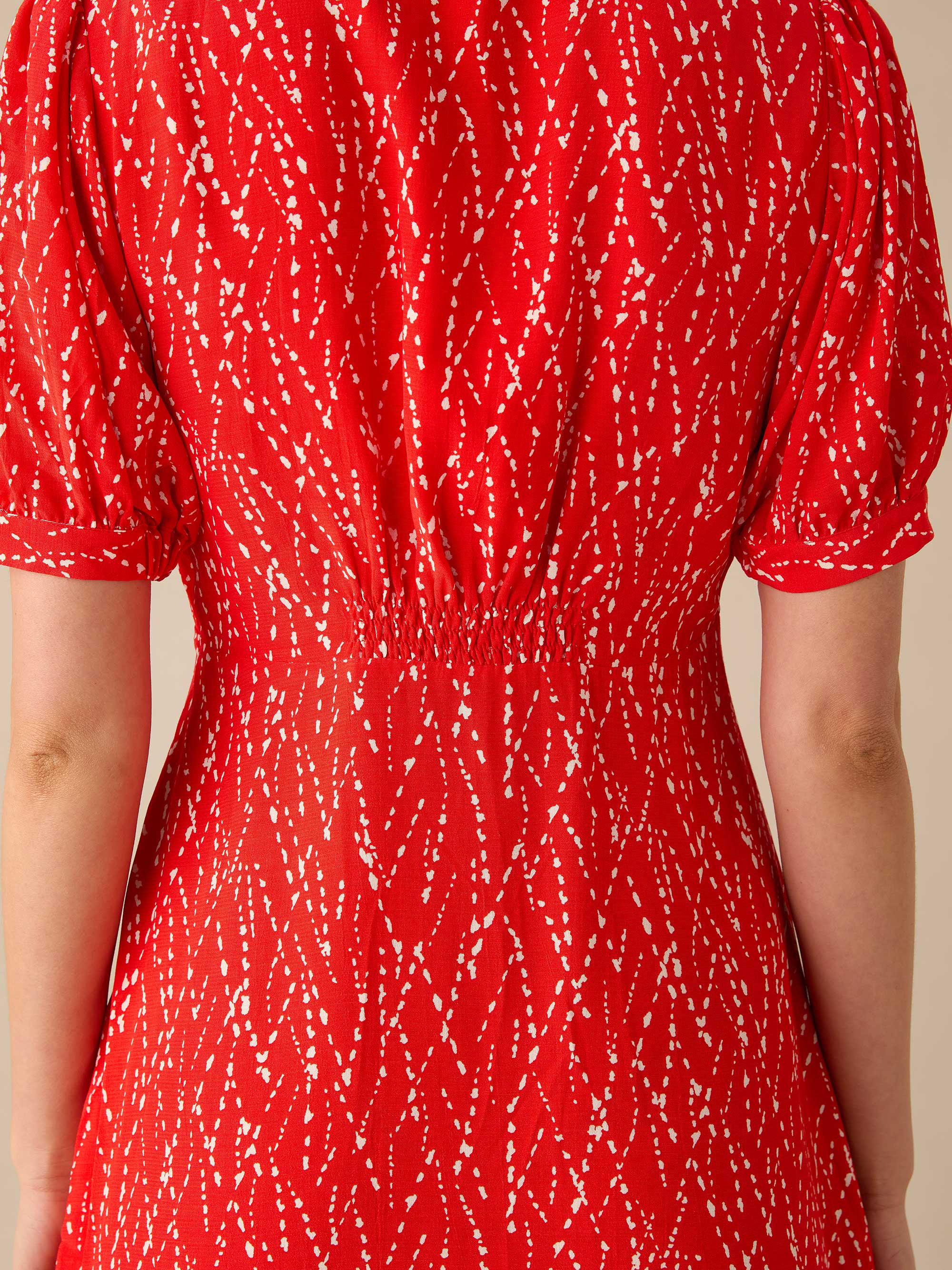 Red Dash Print Shirred Shoulder Short Dress