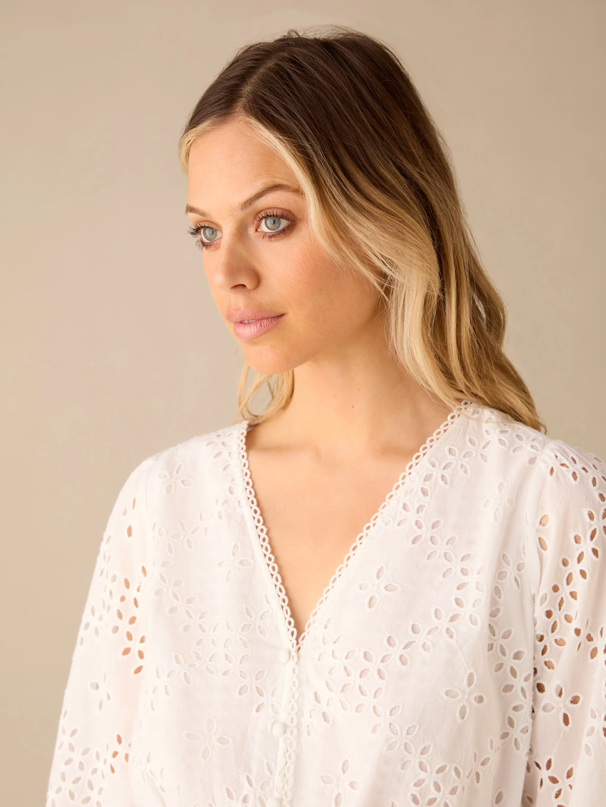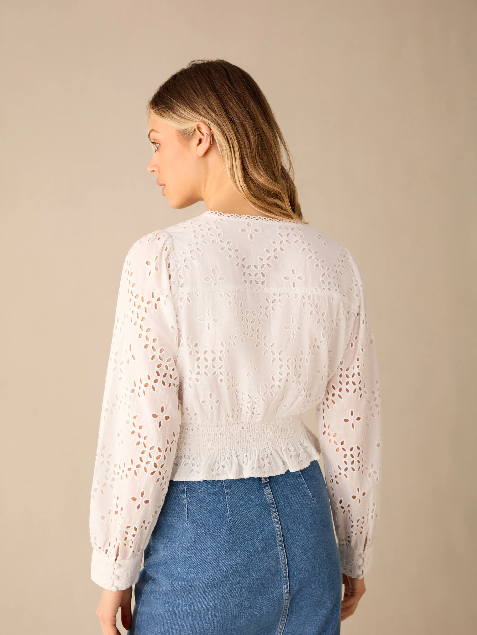 White Broderie Shirred Waist Top