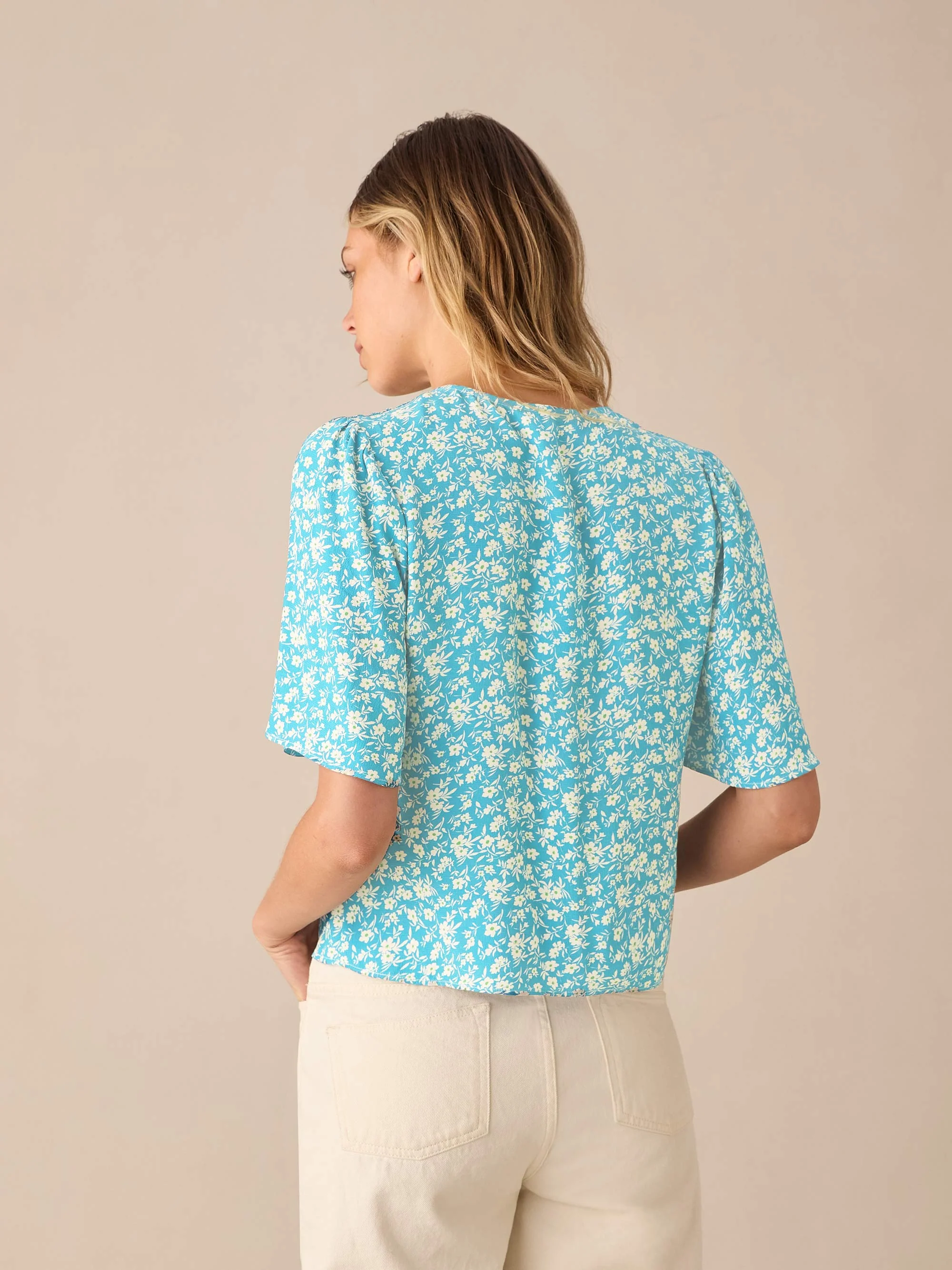 Blue Ditsy Print Flutter Sleeve Top