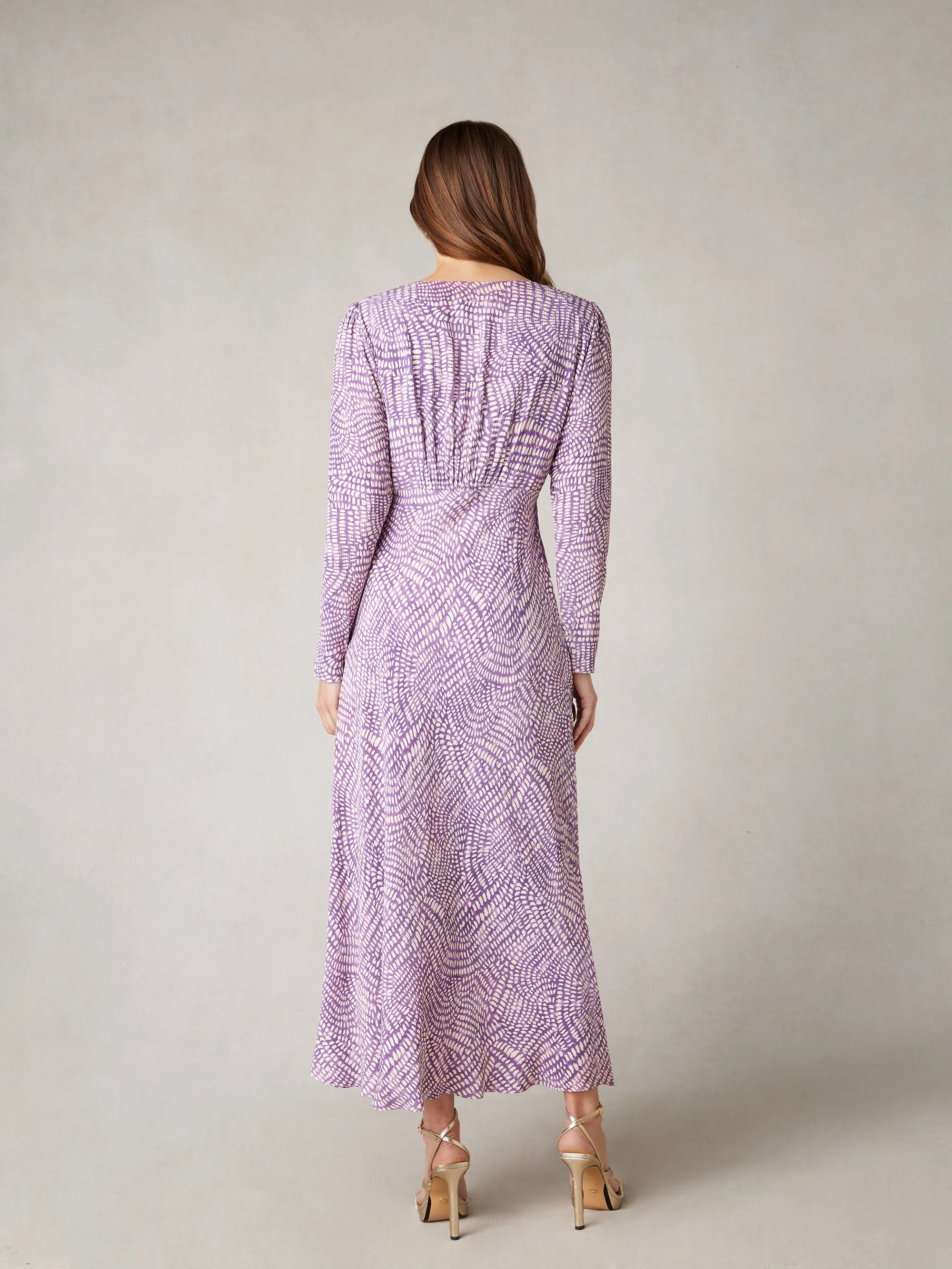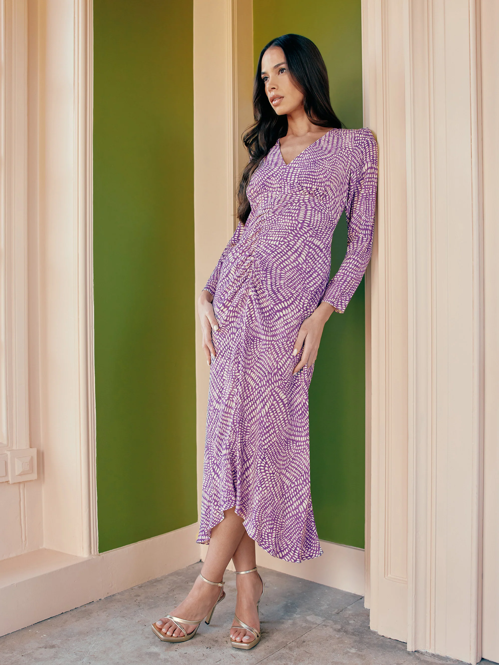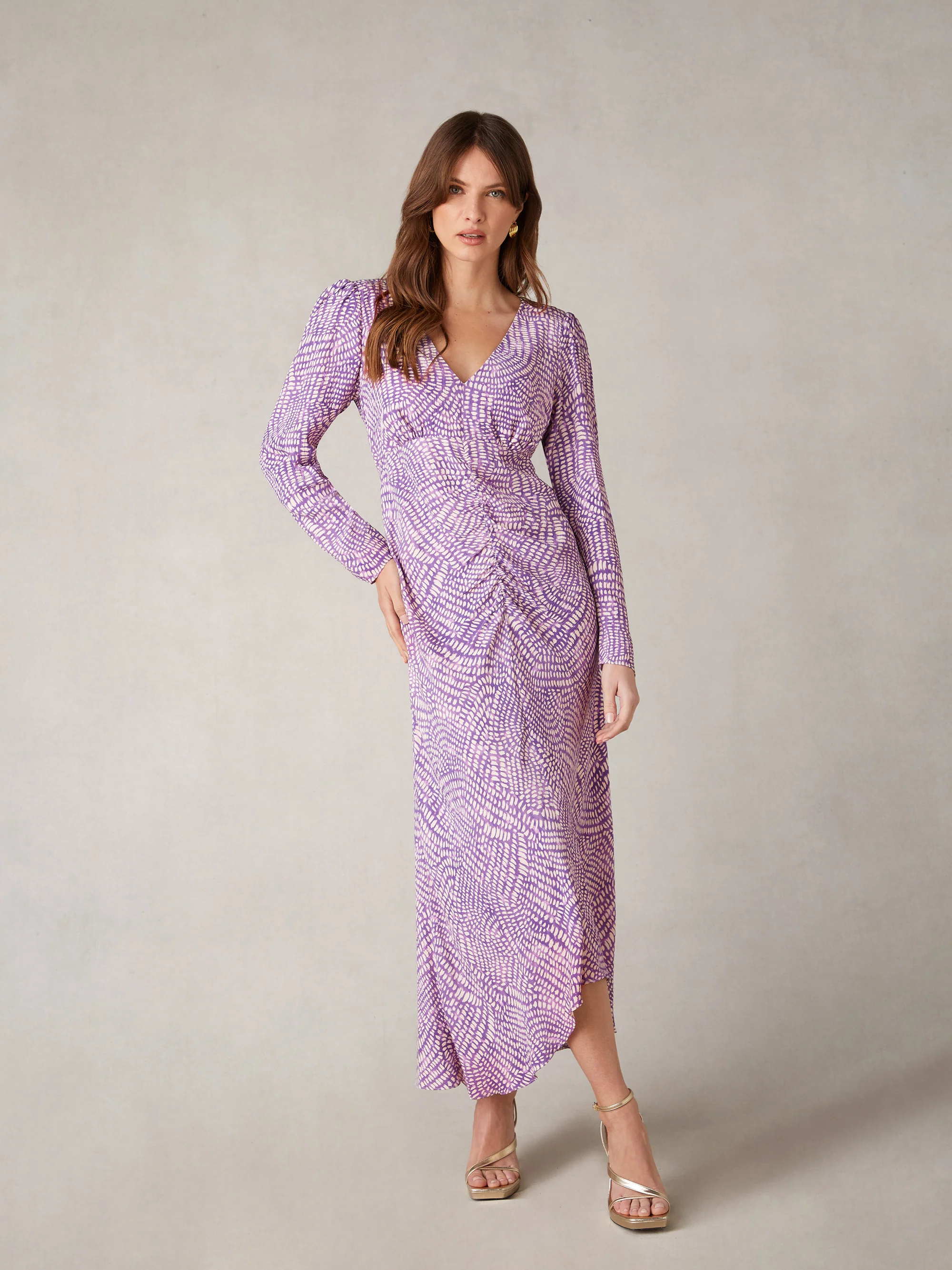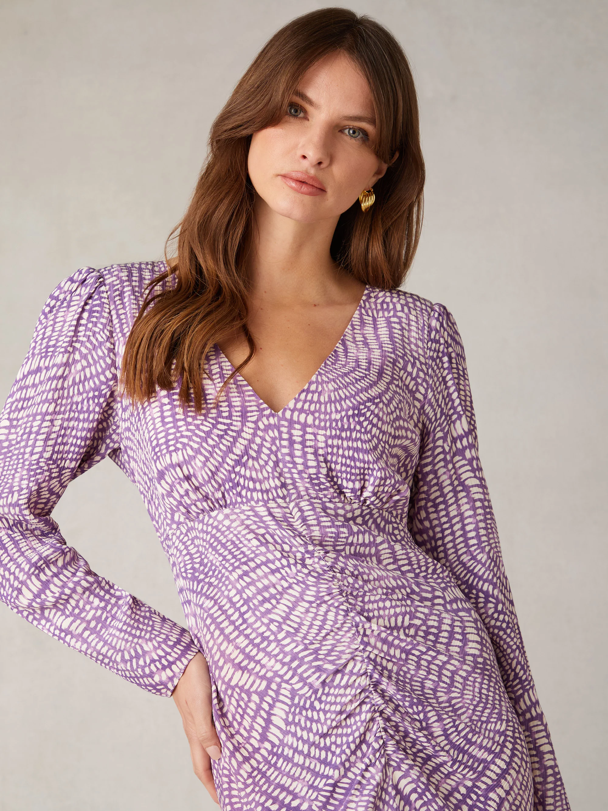Purple Geo Print Ruched Front Midi Dress