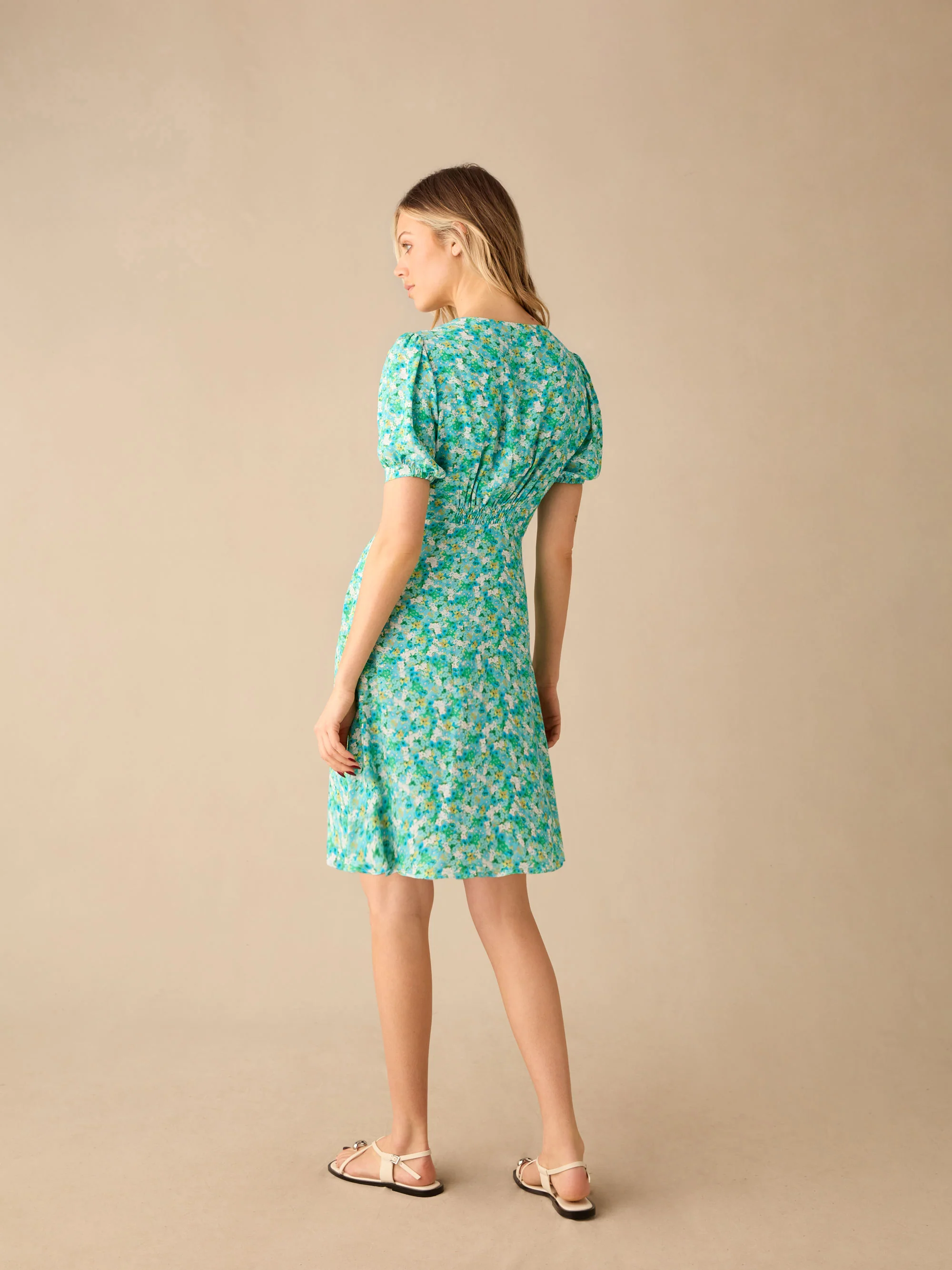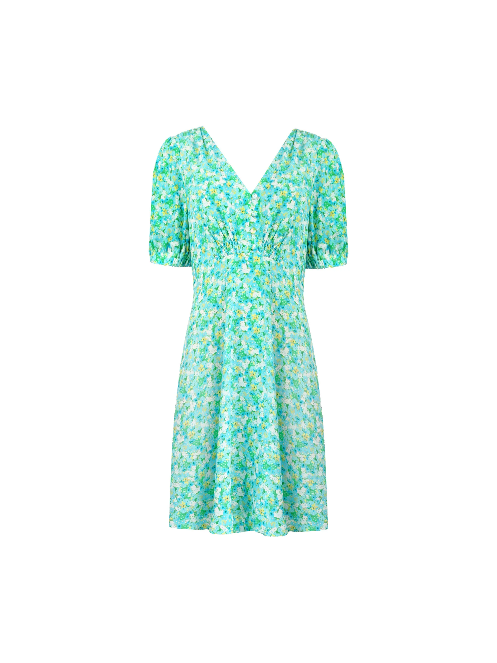 Green Ditsy Shirred Shoulder Short Dress