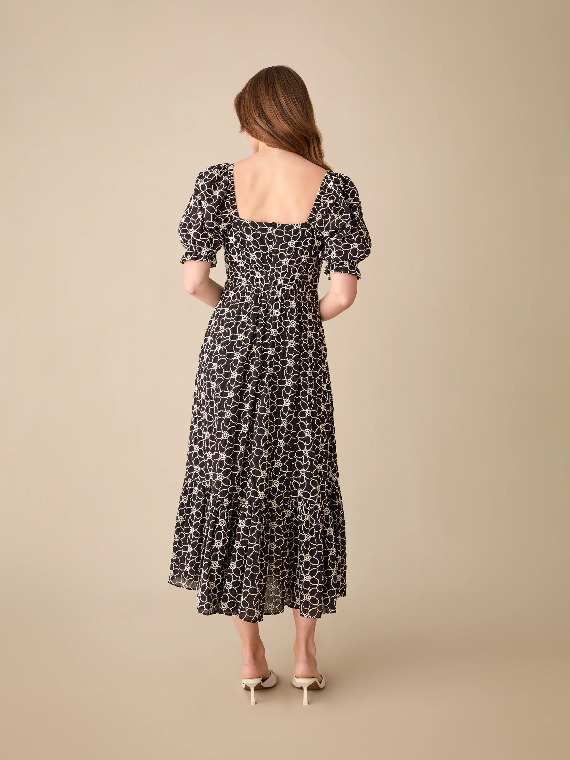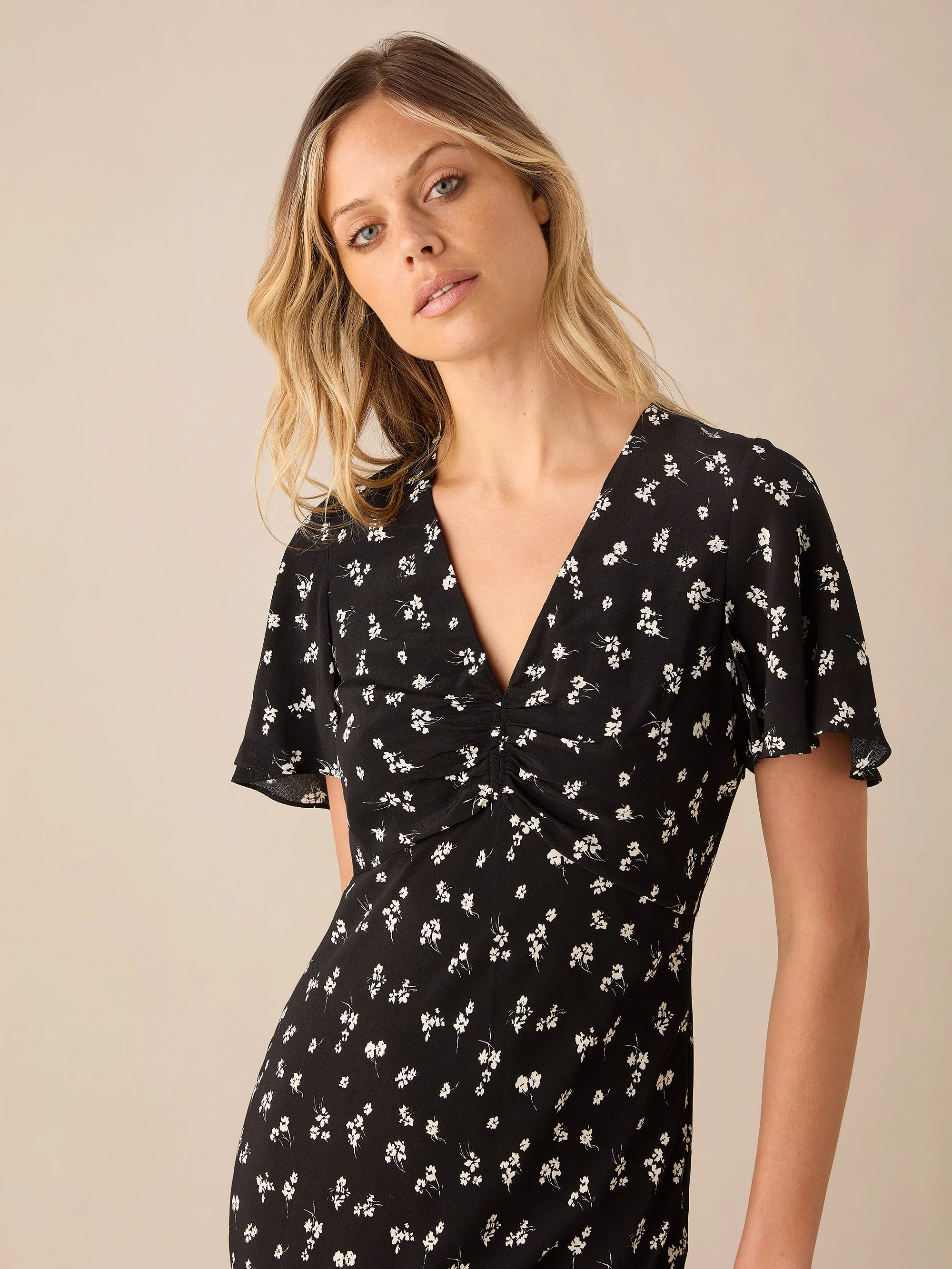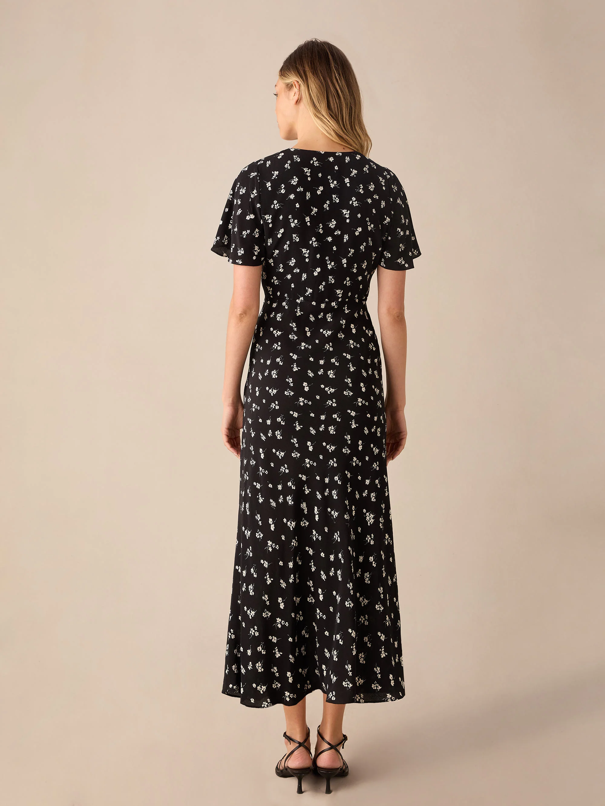 Black Ditsy Floral Print Flutter Sleeve Midi Dress