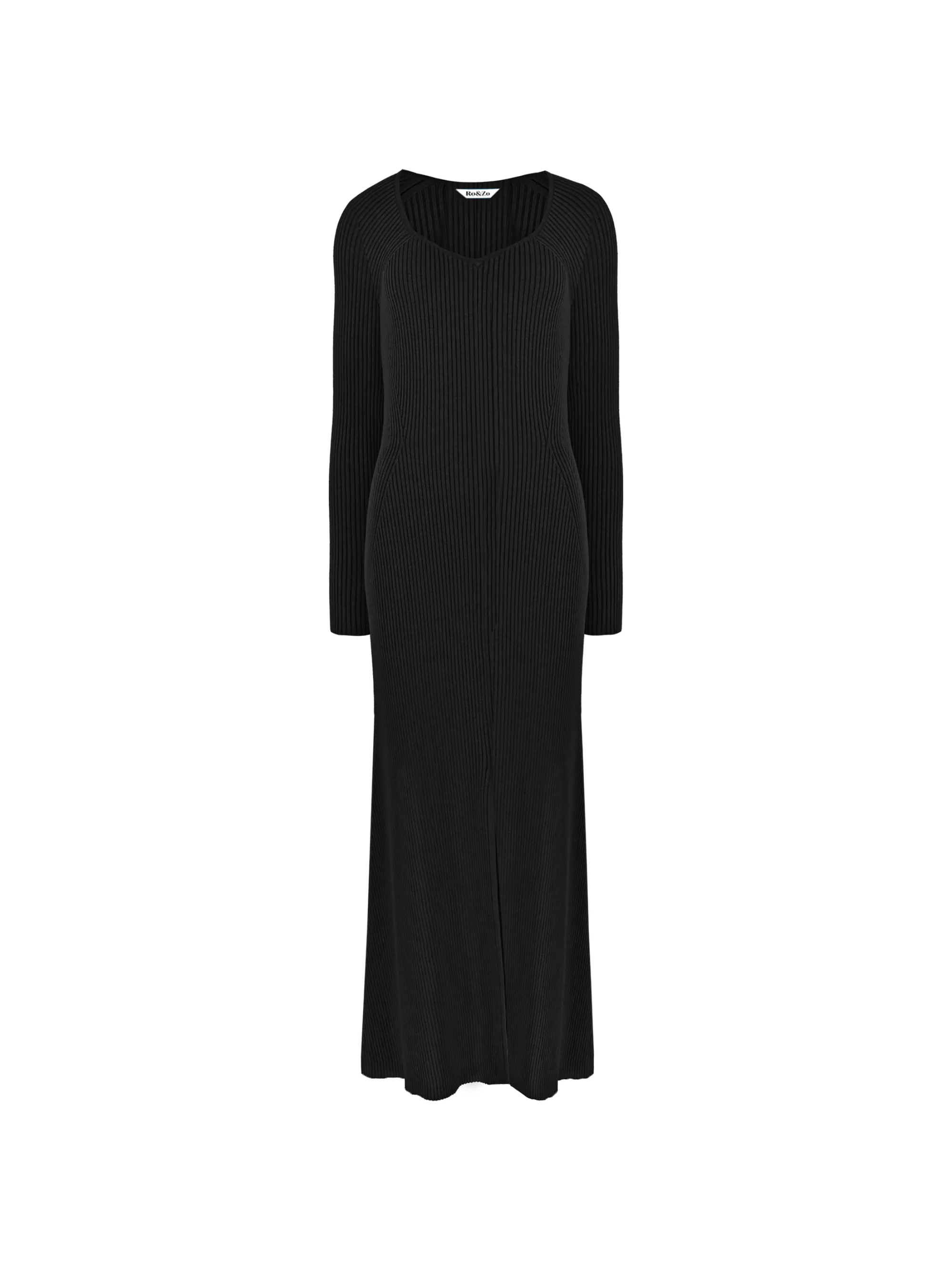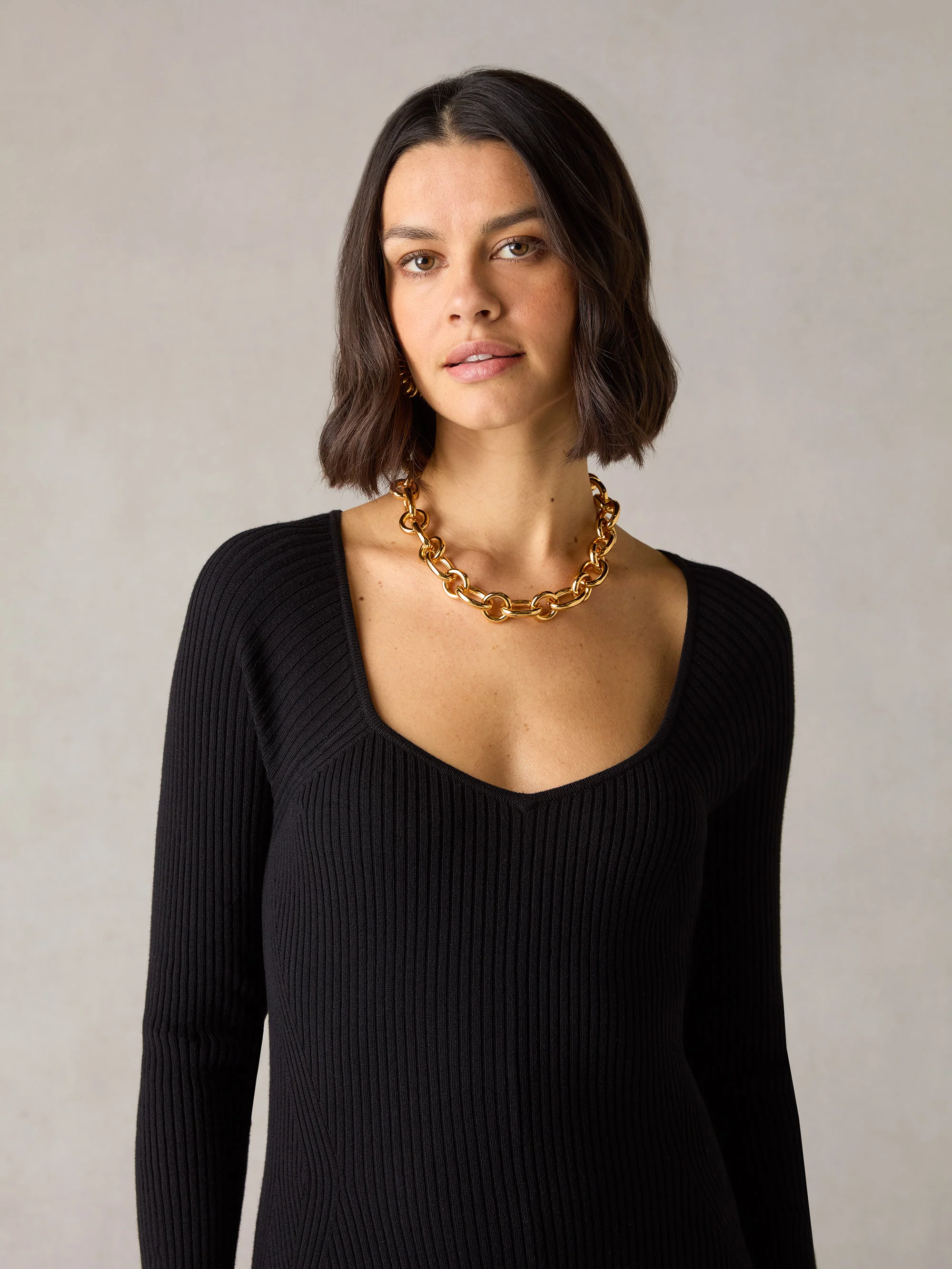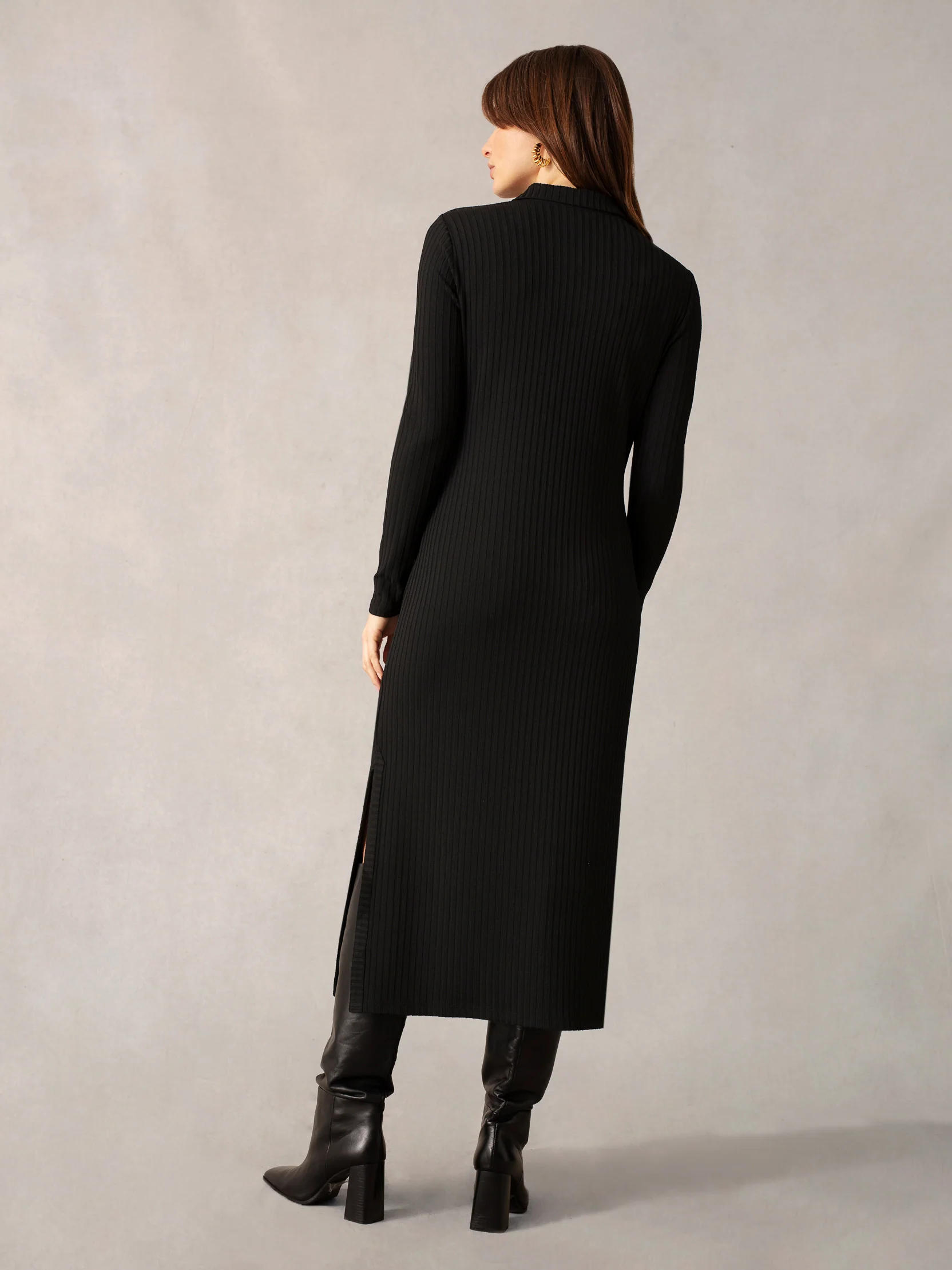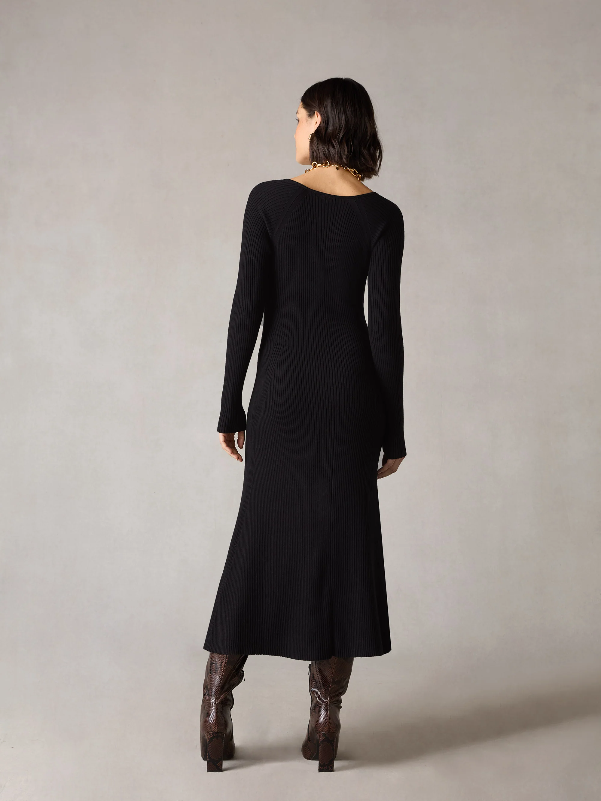Petite Black Rib Knit Sweetheart Neckline Midi Dress