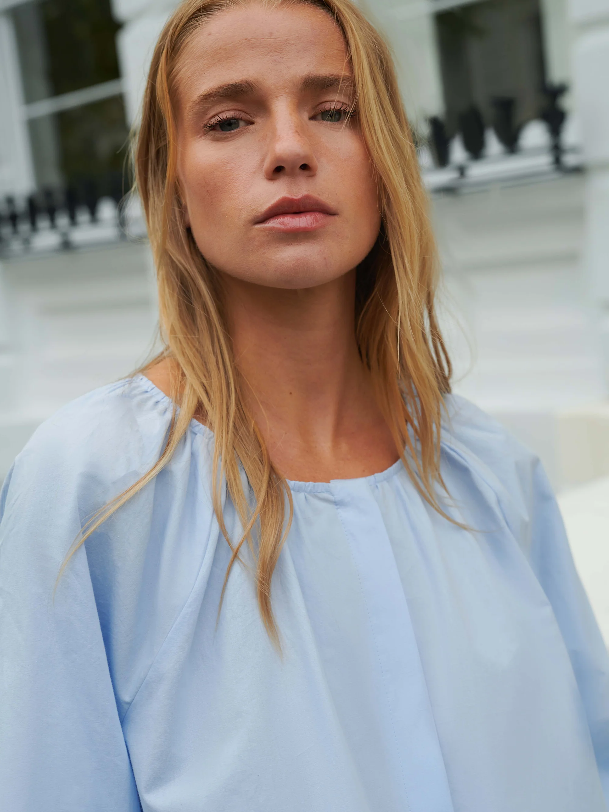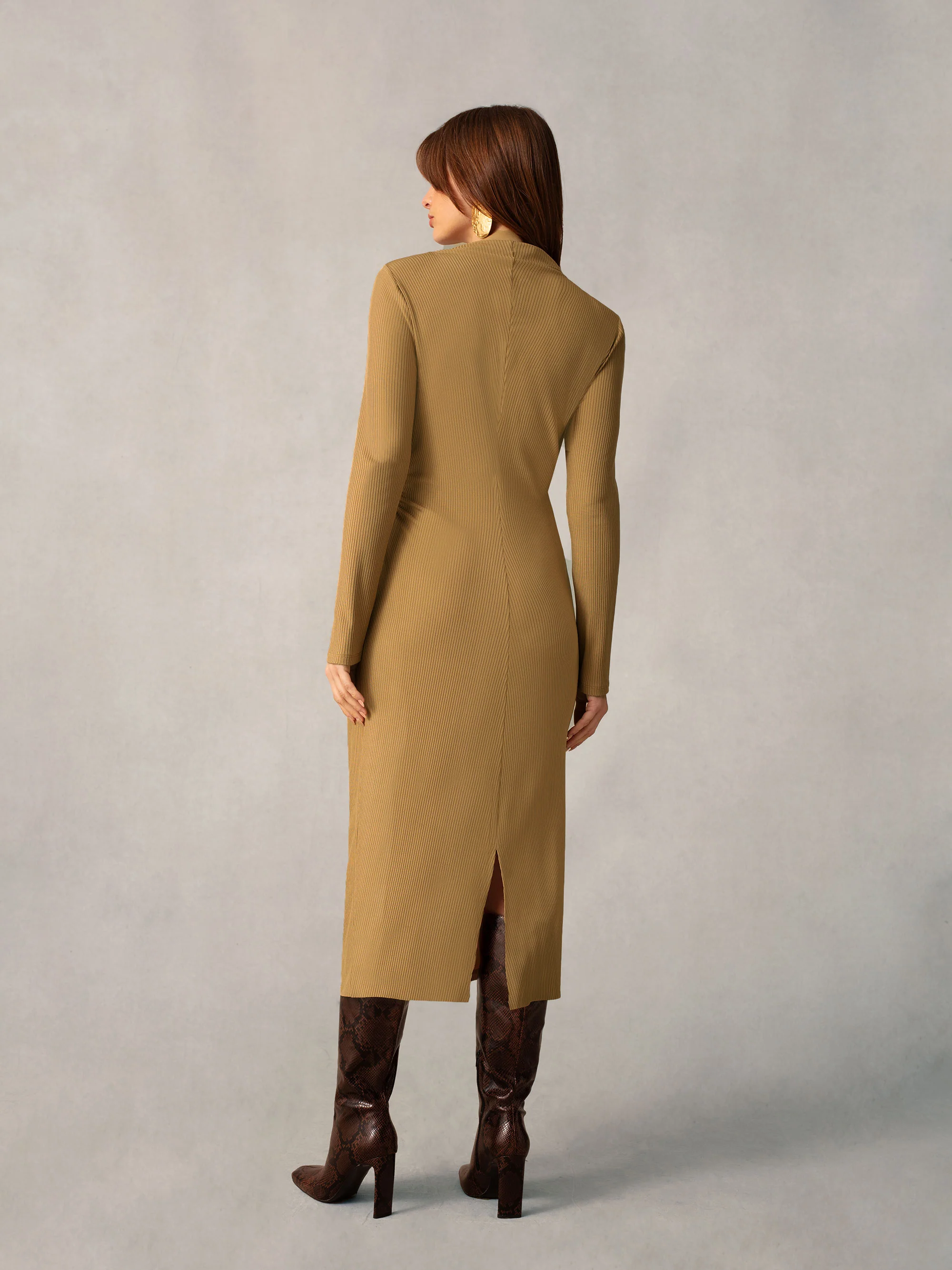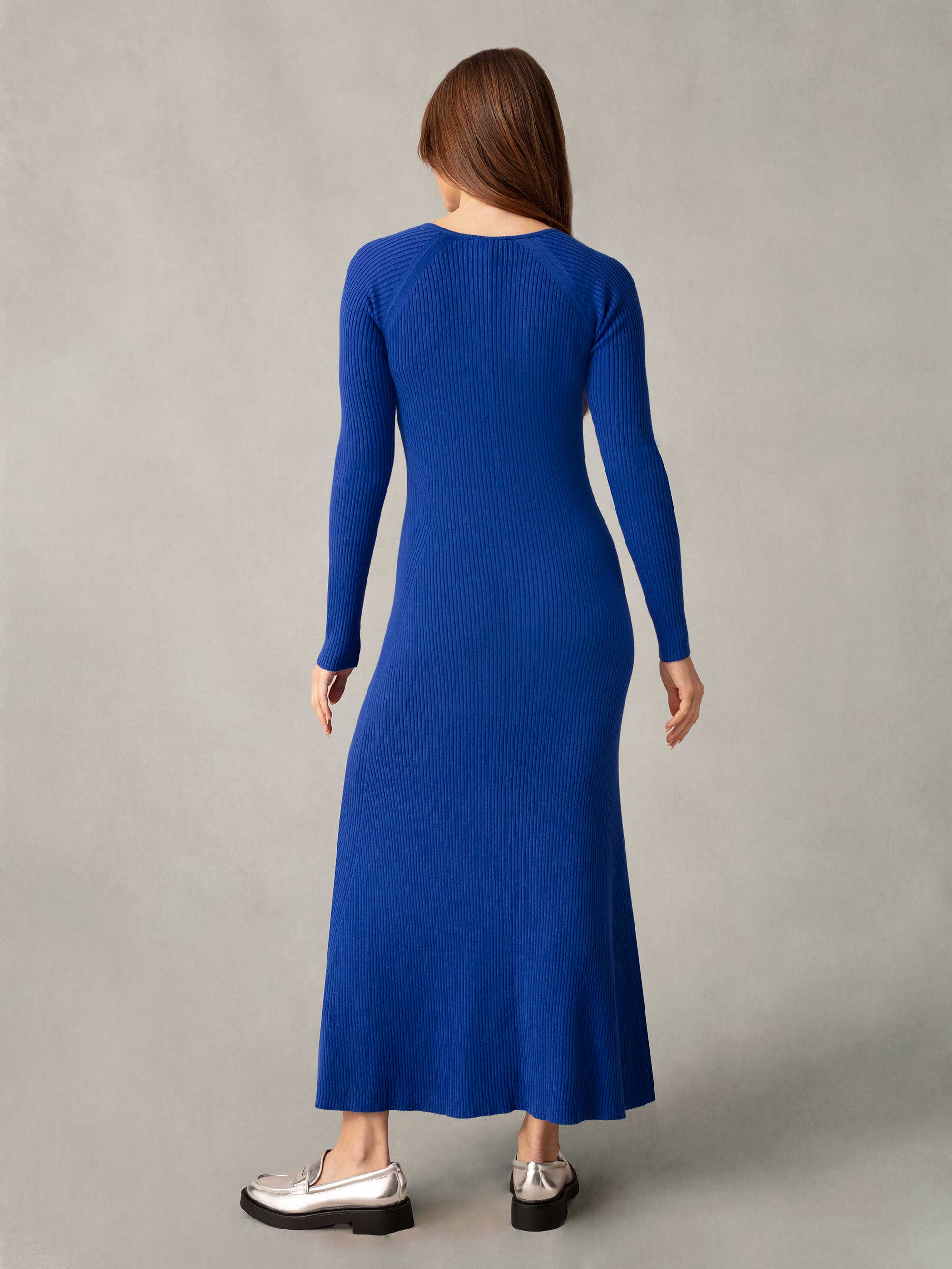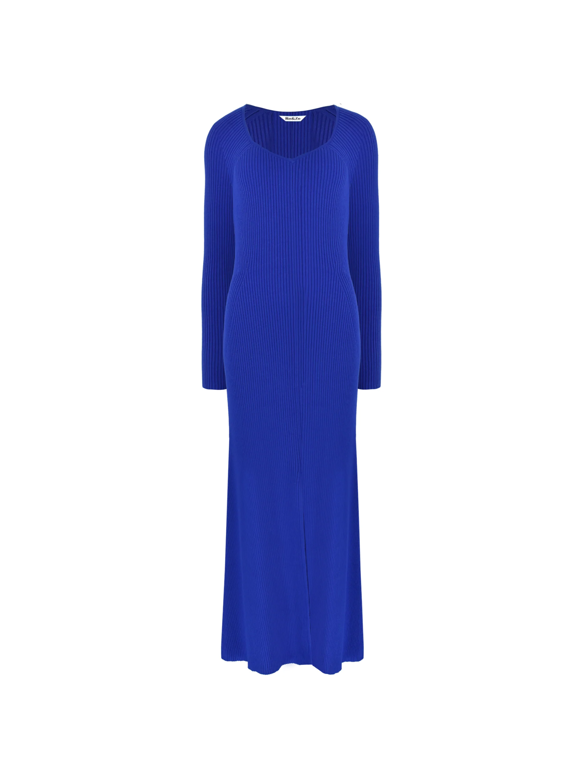 Blue Rib Knit Sweetheart Neckline Midi Dress