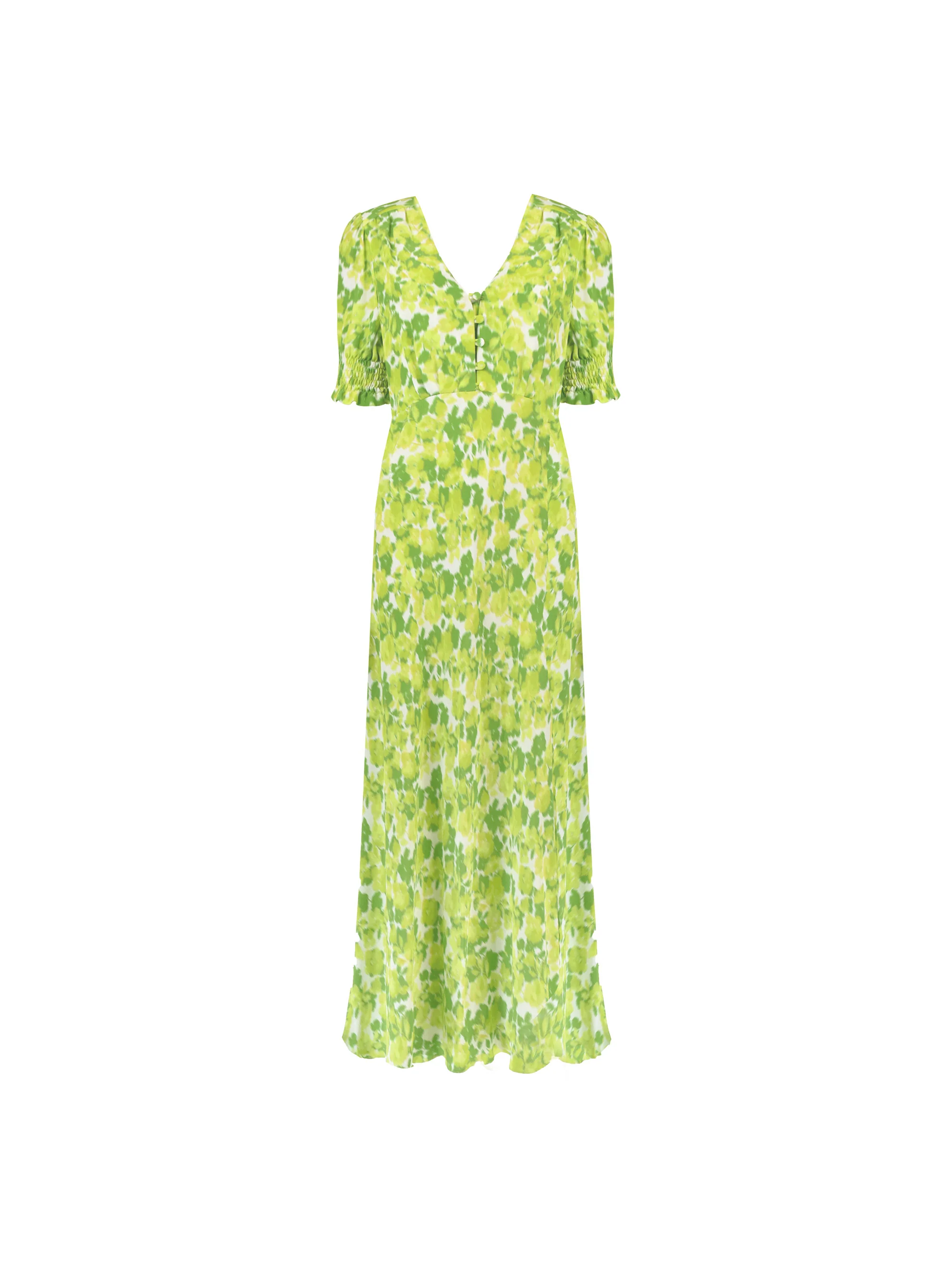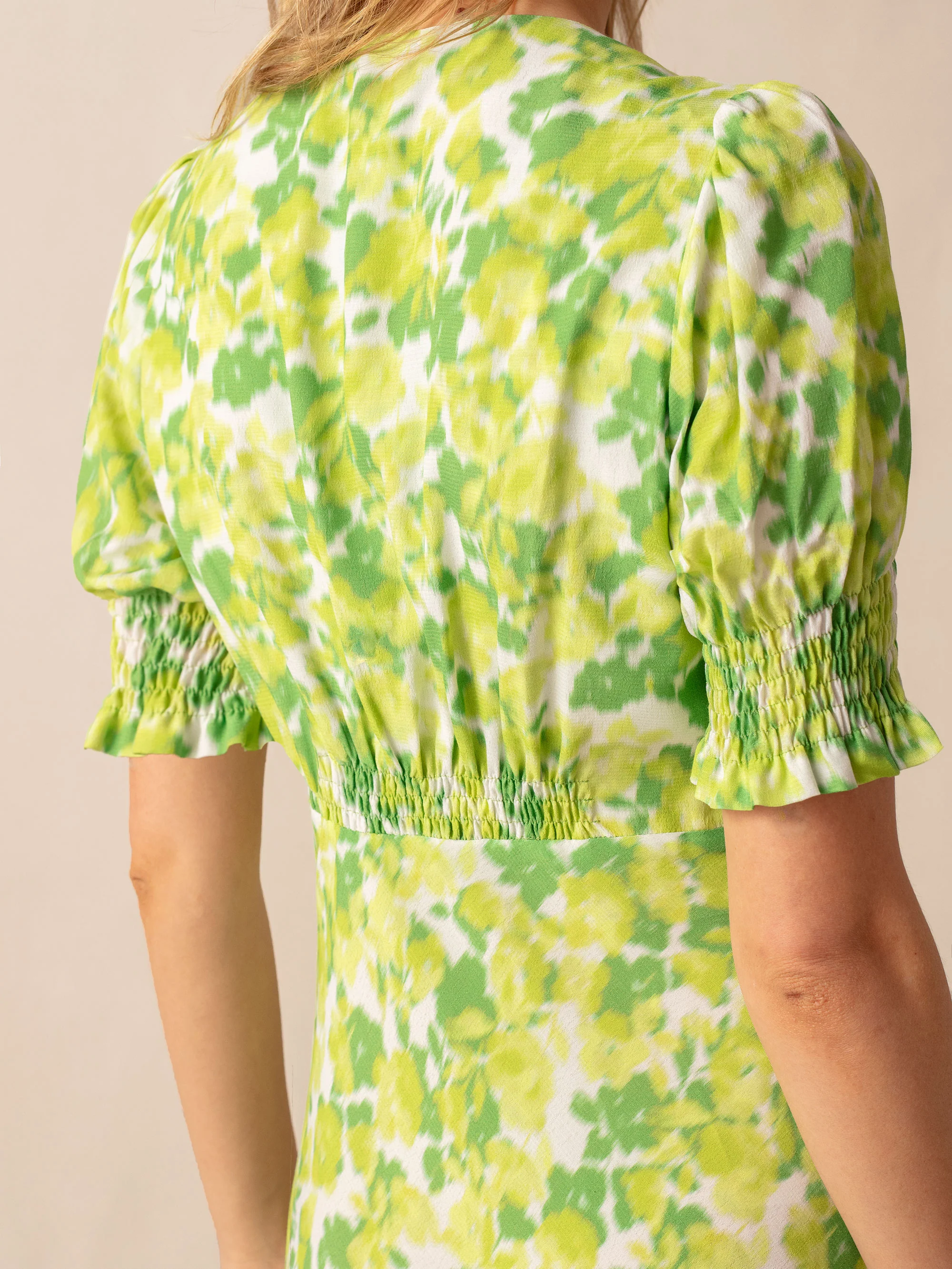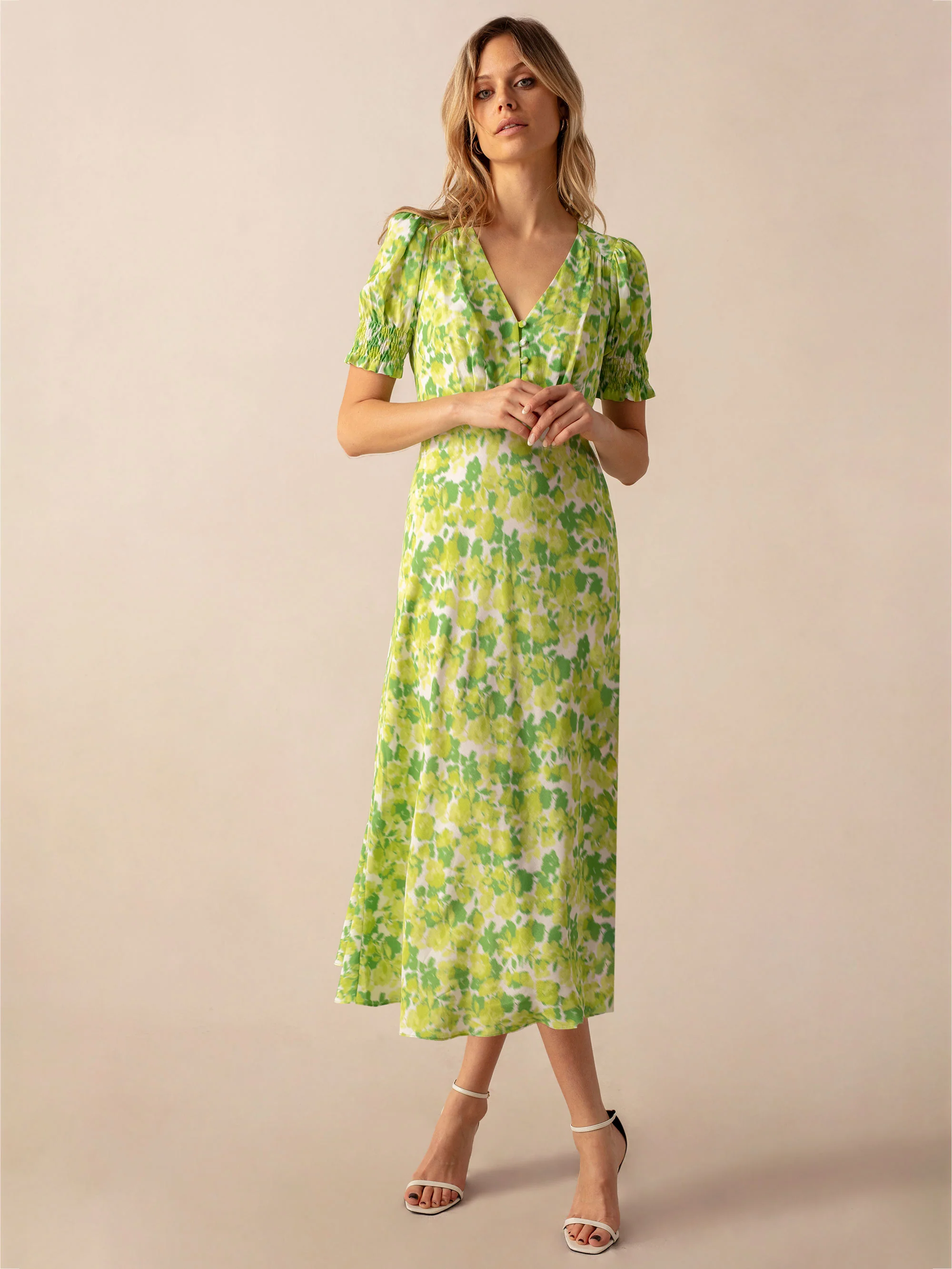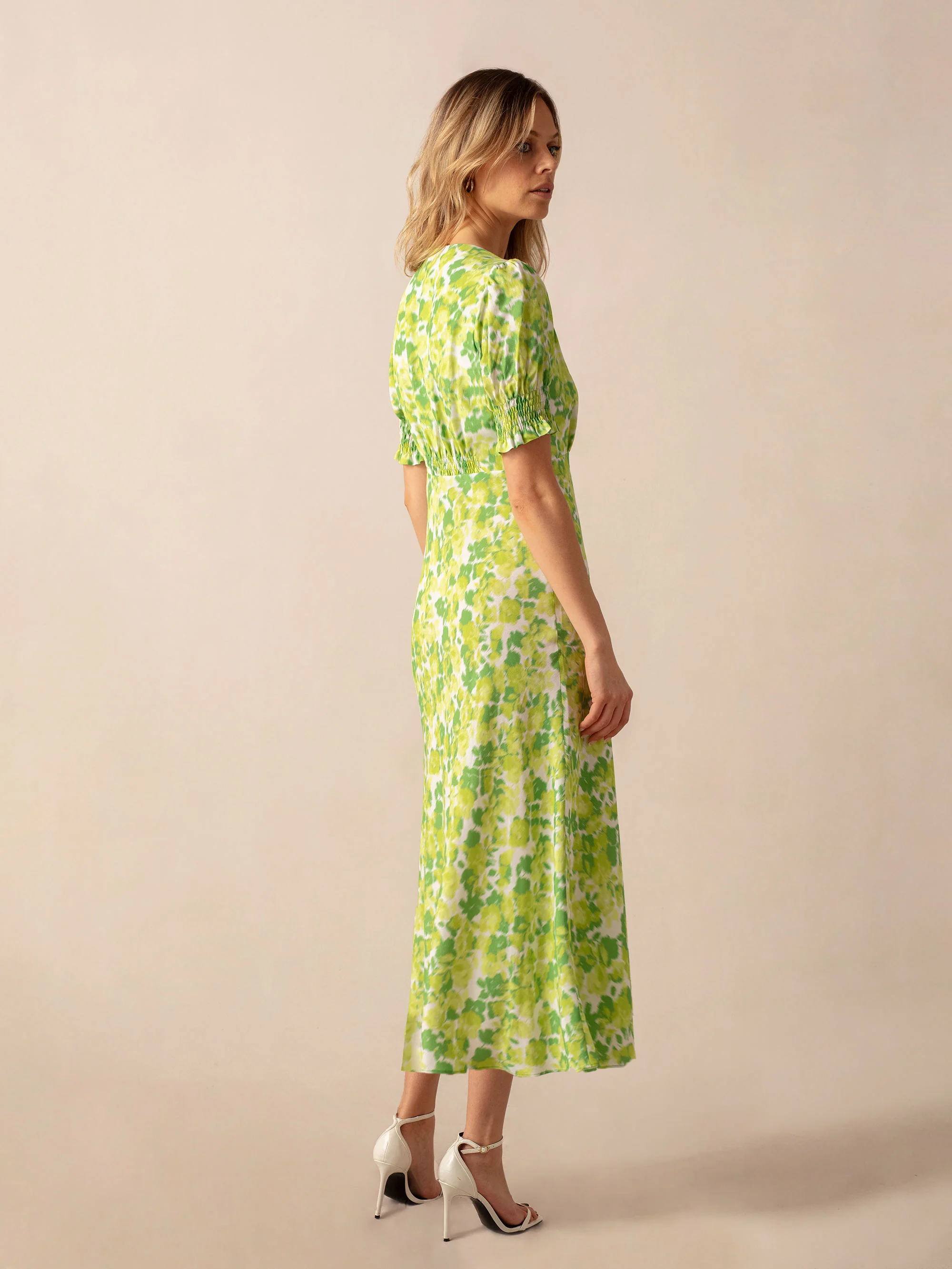Green Botanical Floral Print Shirred Cuff Midi Dress