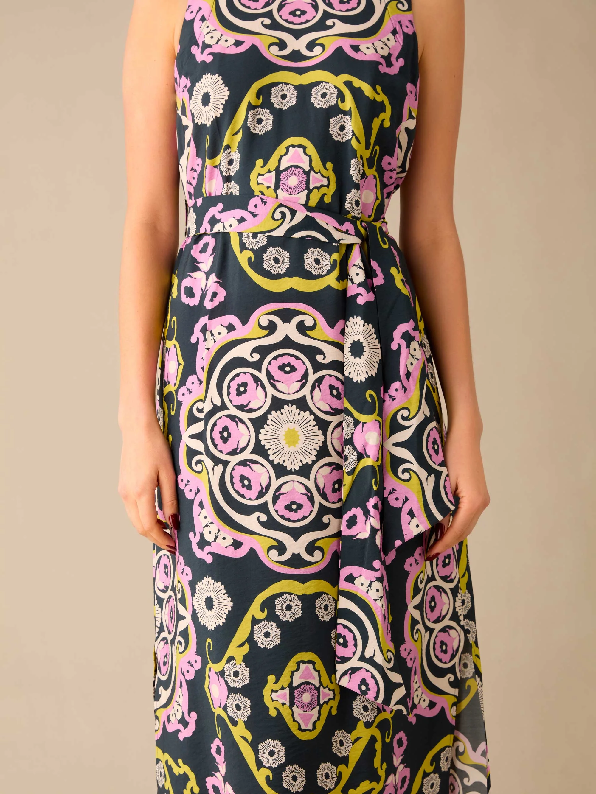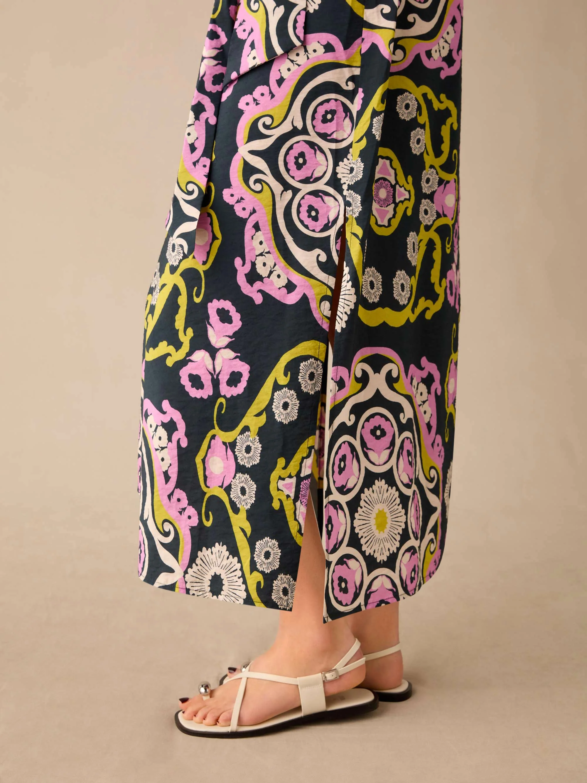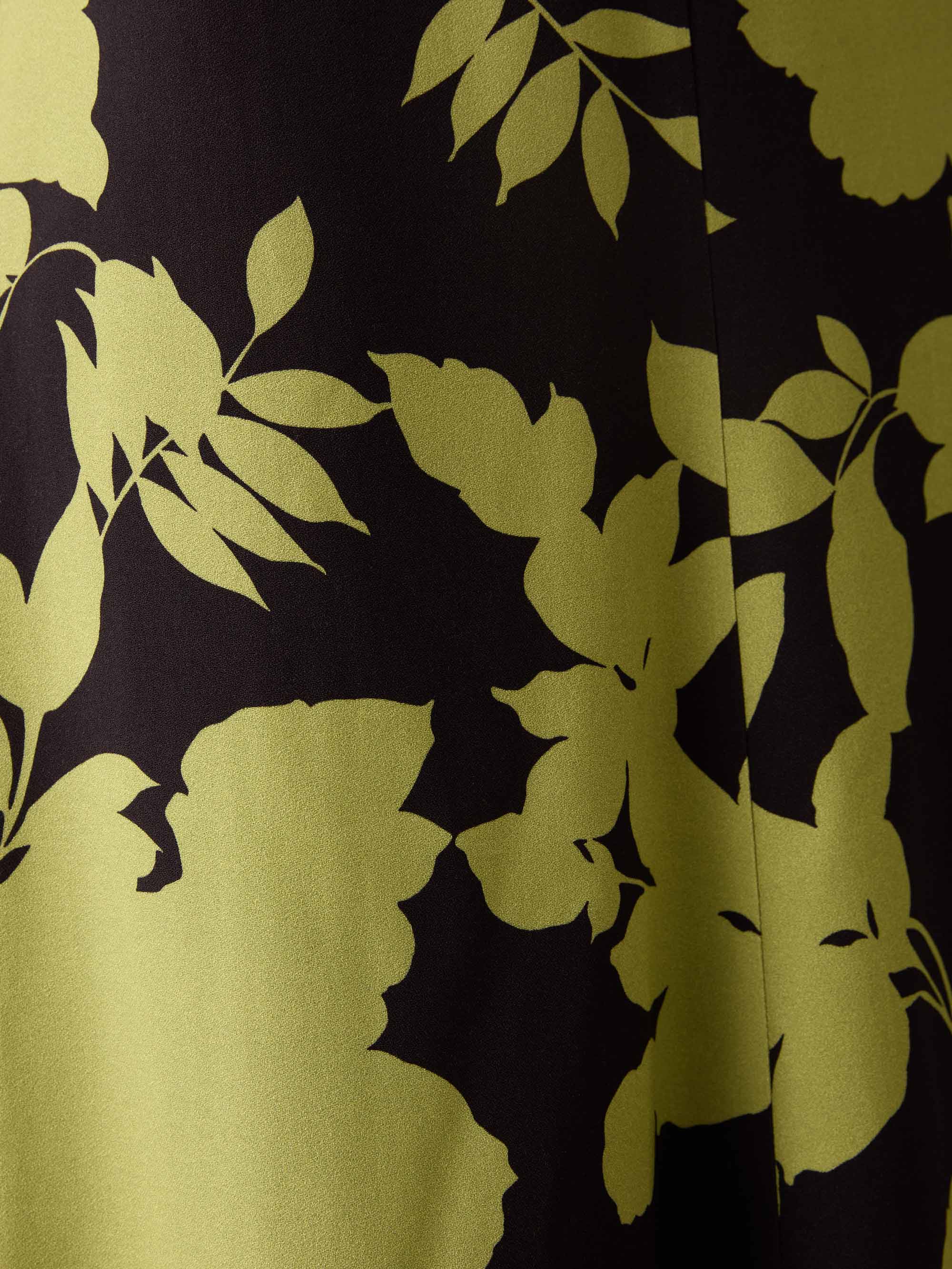 Green Botanical Floral Print Shirred Cuff Midi Dress
