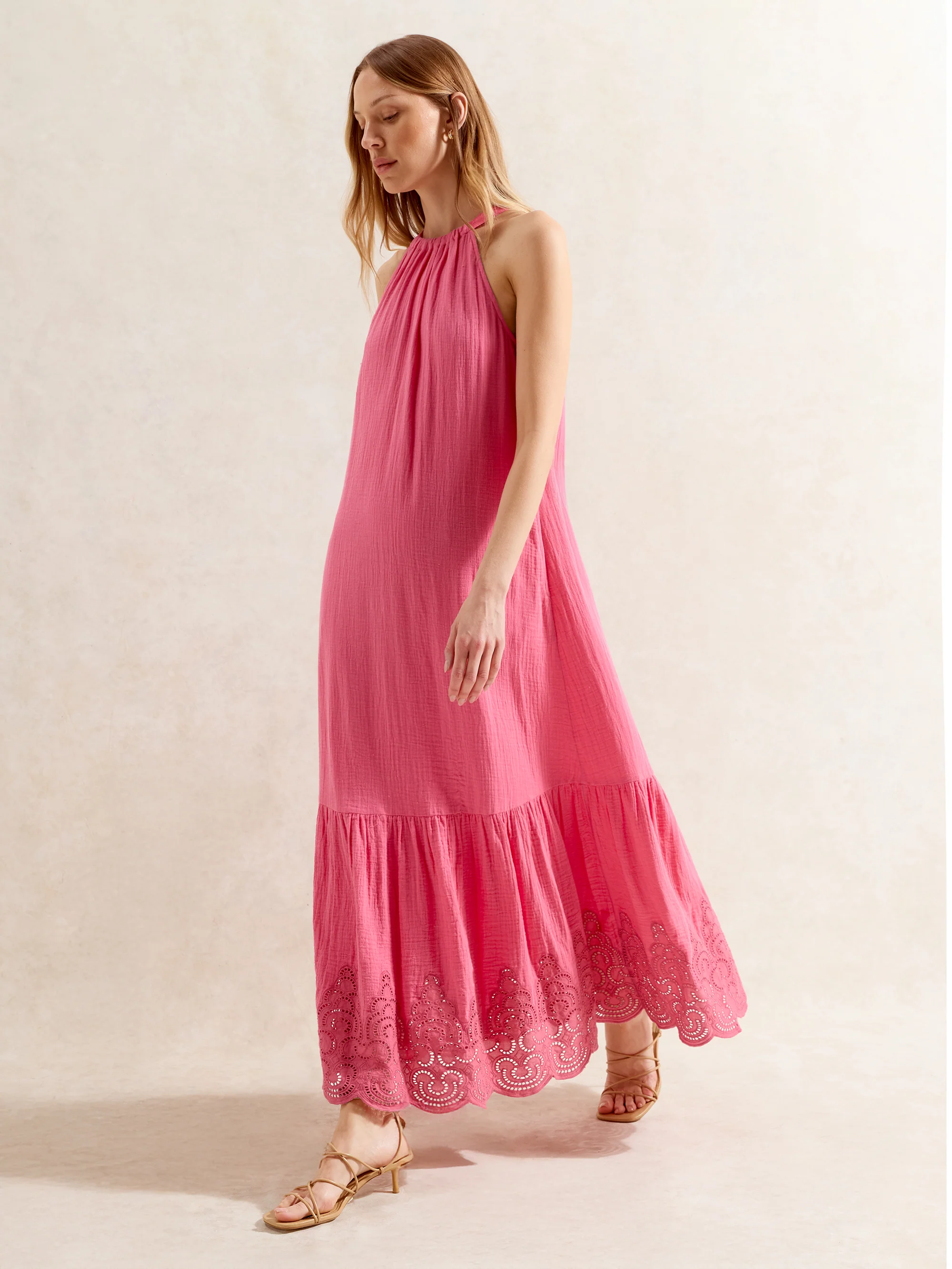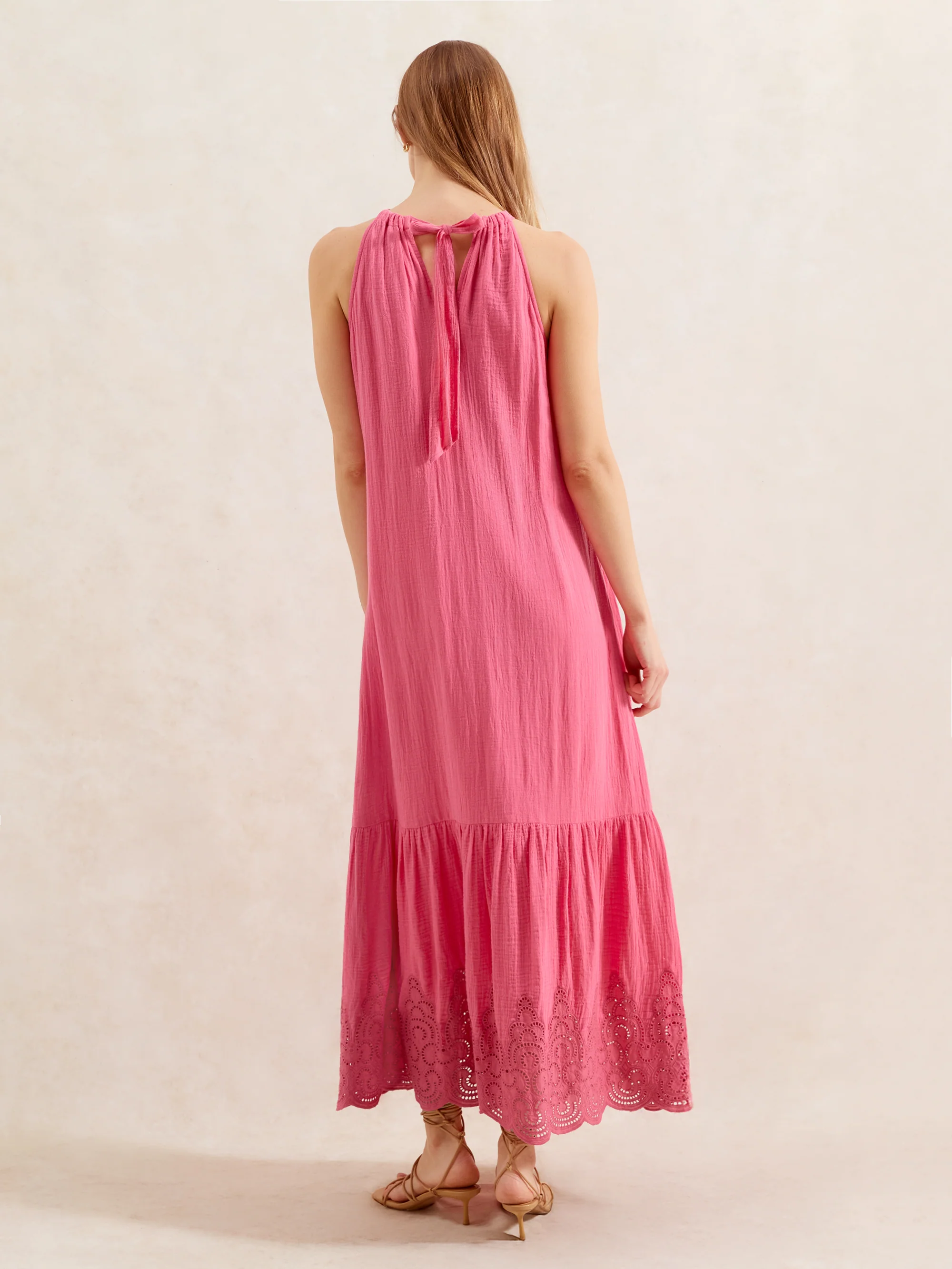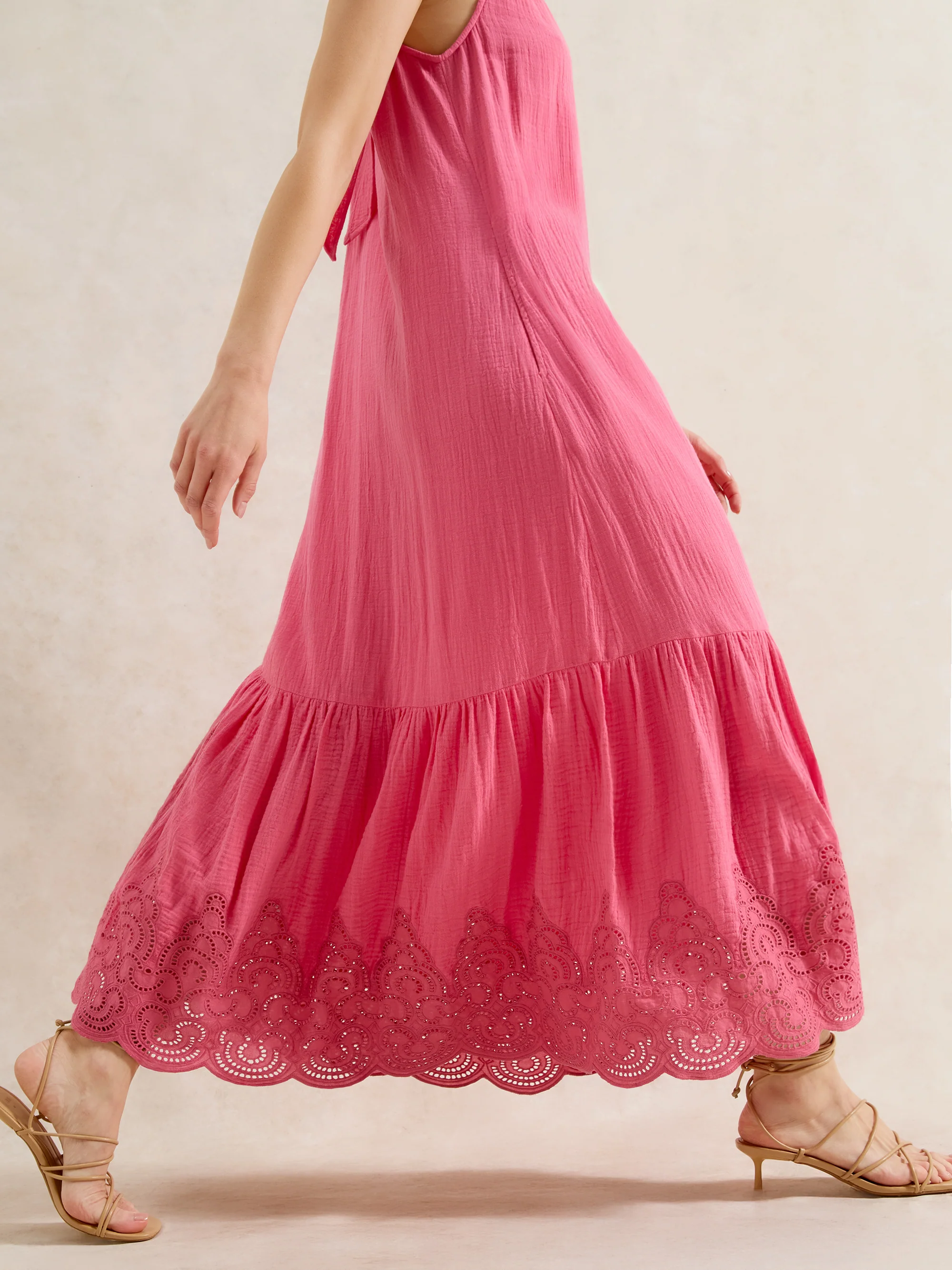 Pink Broderie Hem Cheesecloth Maxi Dress